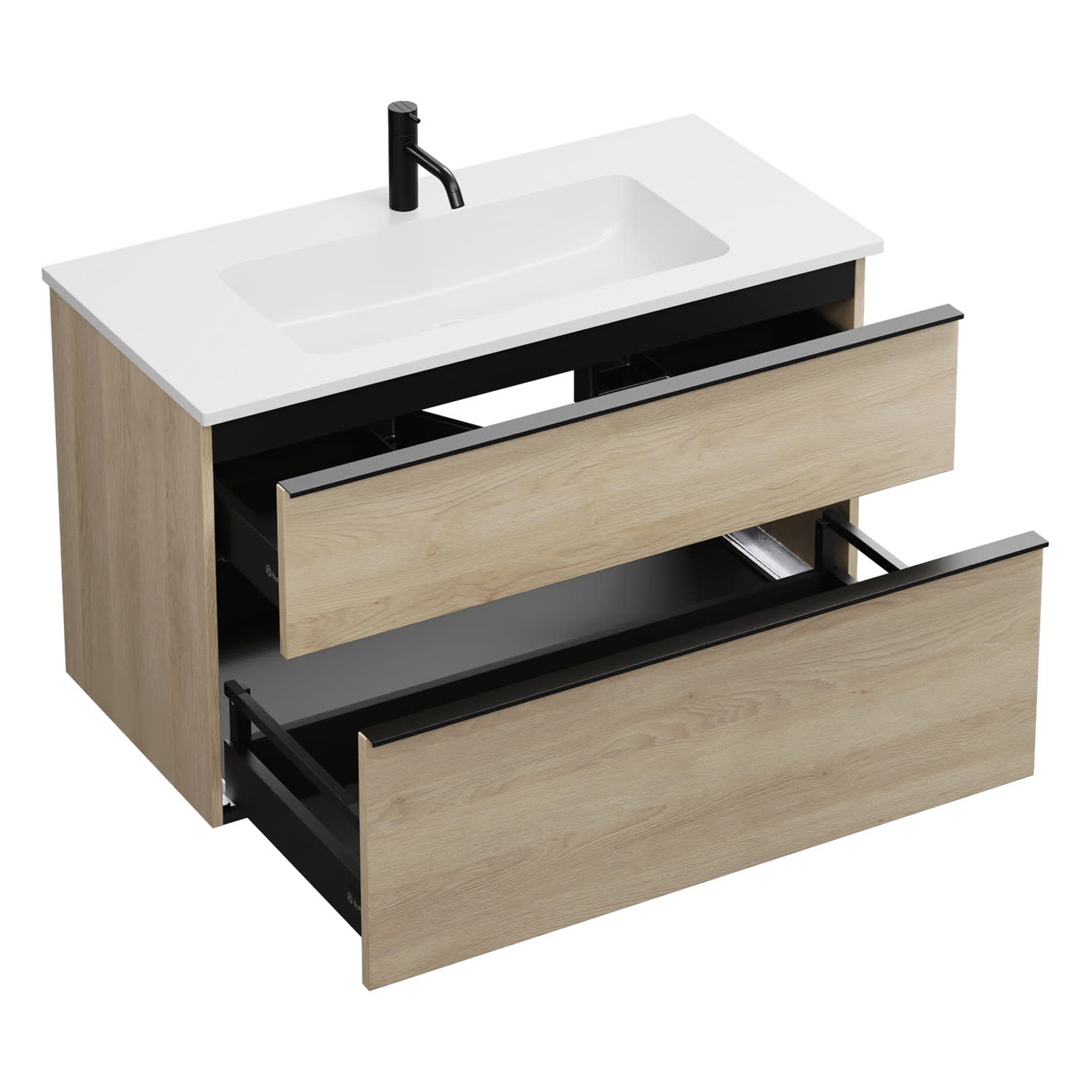 - 1 Schublade oben, 35 cm tief, mit Siphonausschnitt und Inneneinteilung