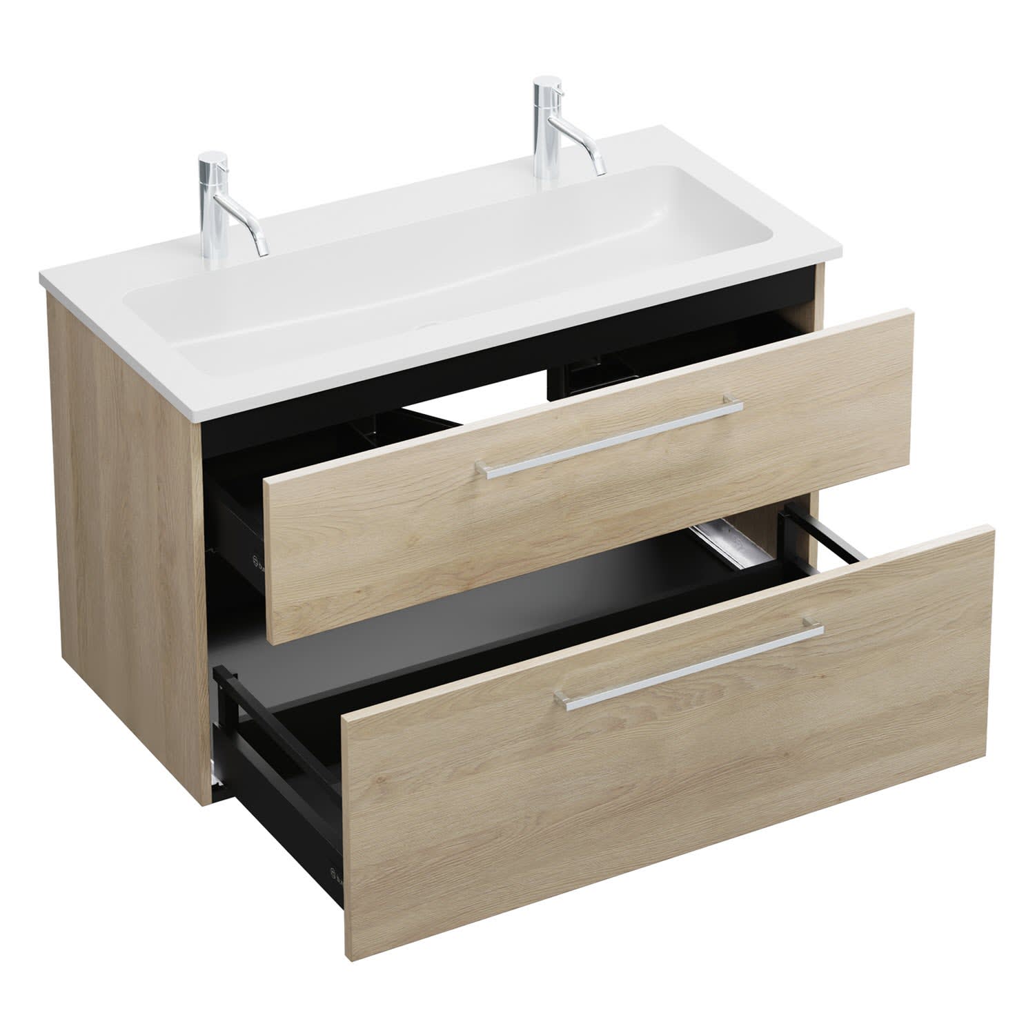 - 1 Schublade oben, 35 cm tief, mit Siphonausschnitt und Inneneinteilung