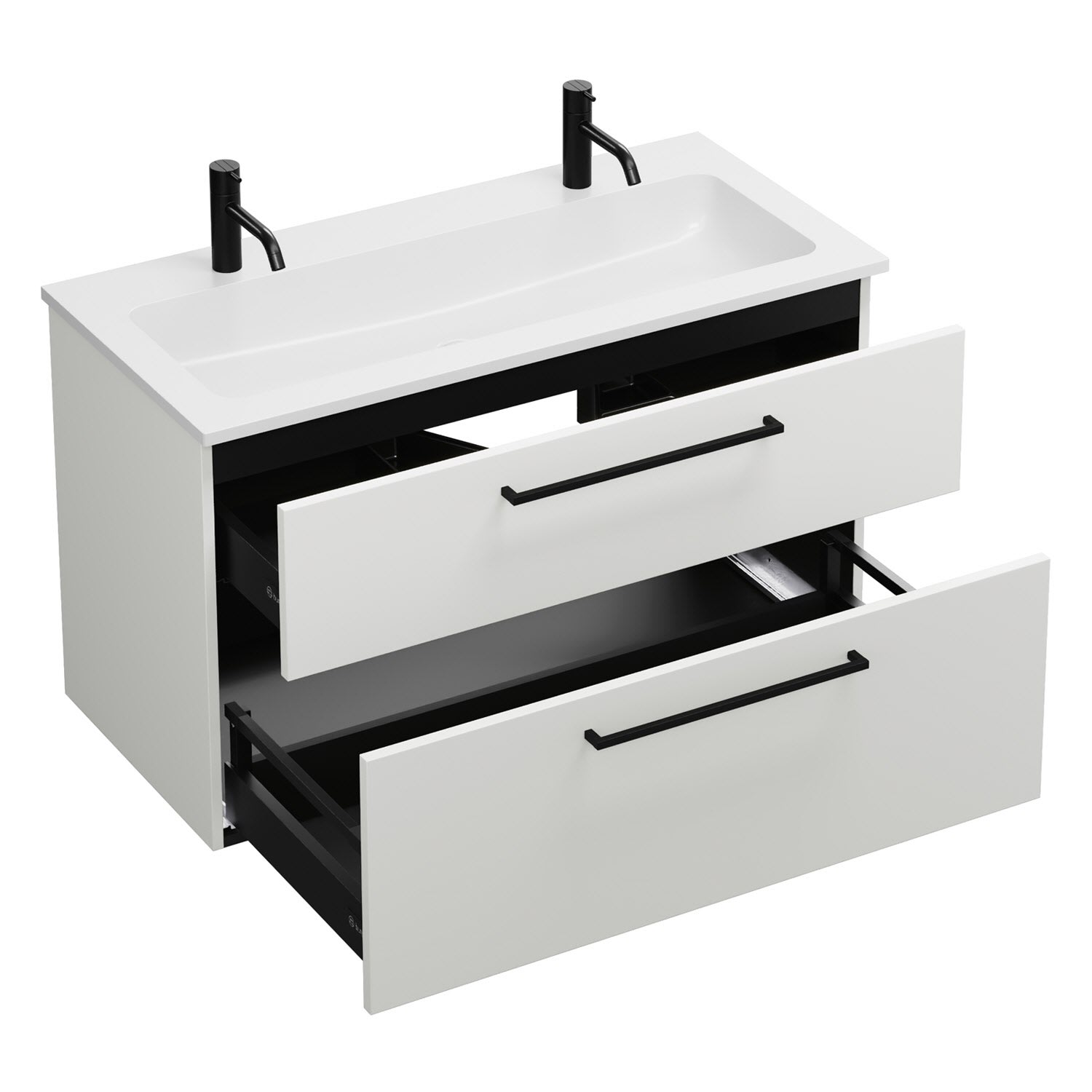 - 1 Schublade oben, 35 cm tief, mit Siphonausschnitt und Inneneinteilung