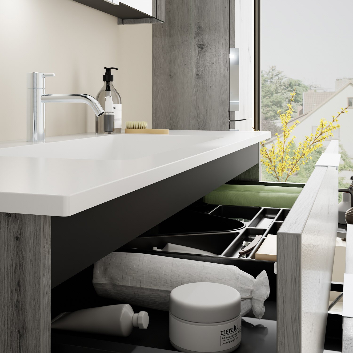 - 1 Schublade oben, 35 cm tief, mit Siphonausschnitt und Inneneinteilung
