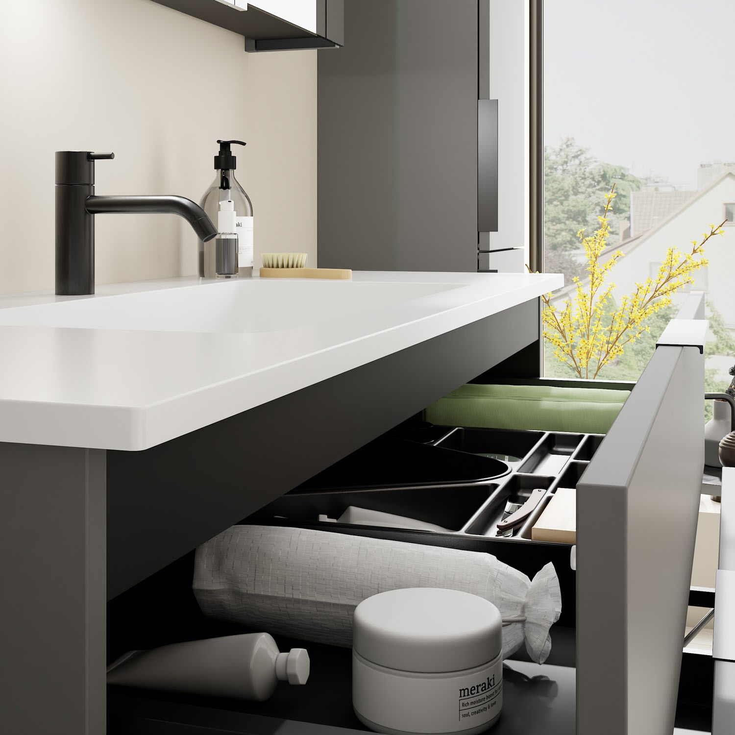 - 1 Schublade oben, 35 cm tief, mit Siphonausschnitt und Inneneinteilung