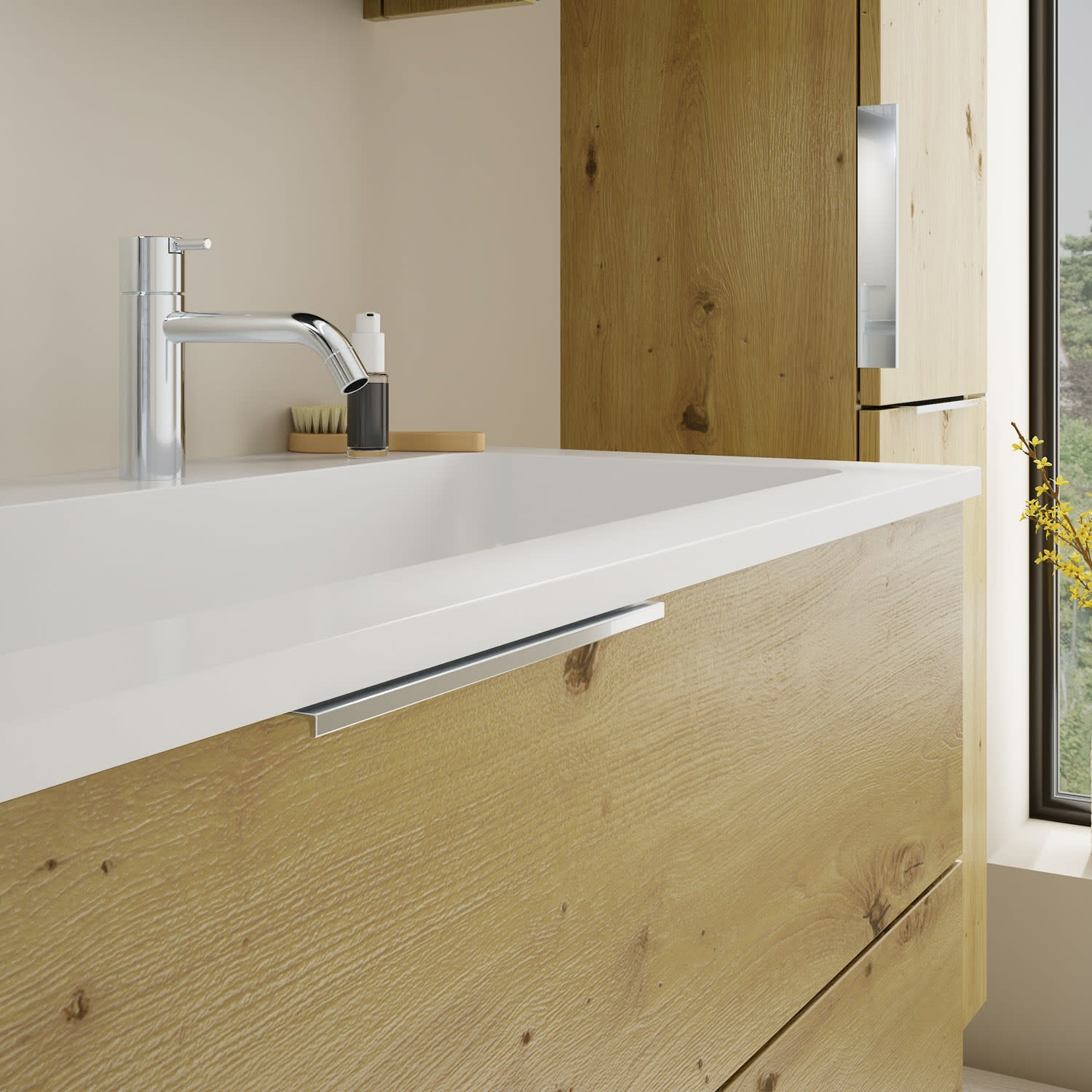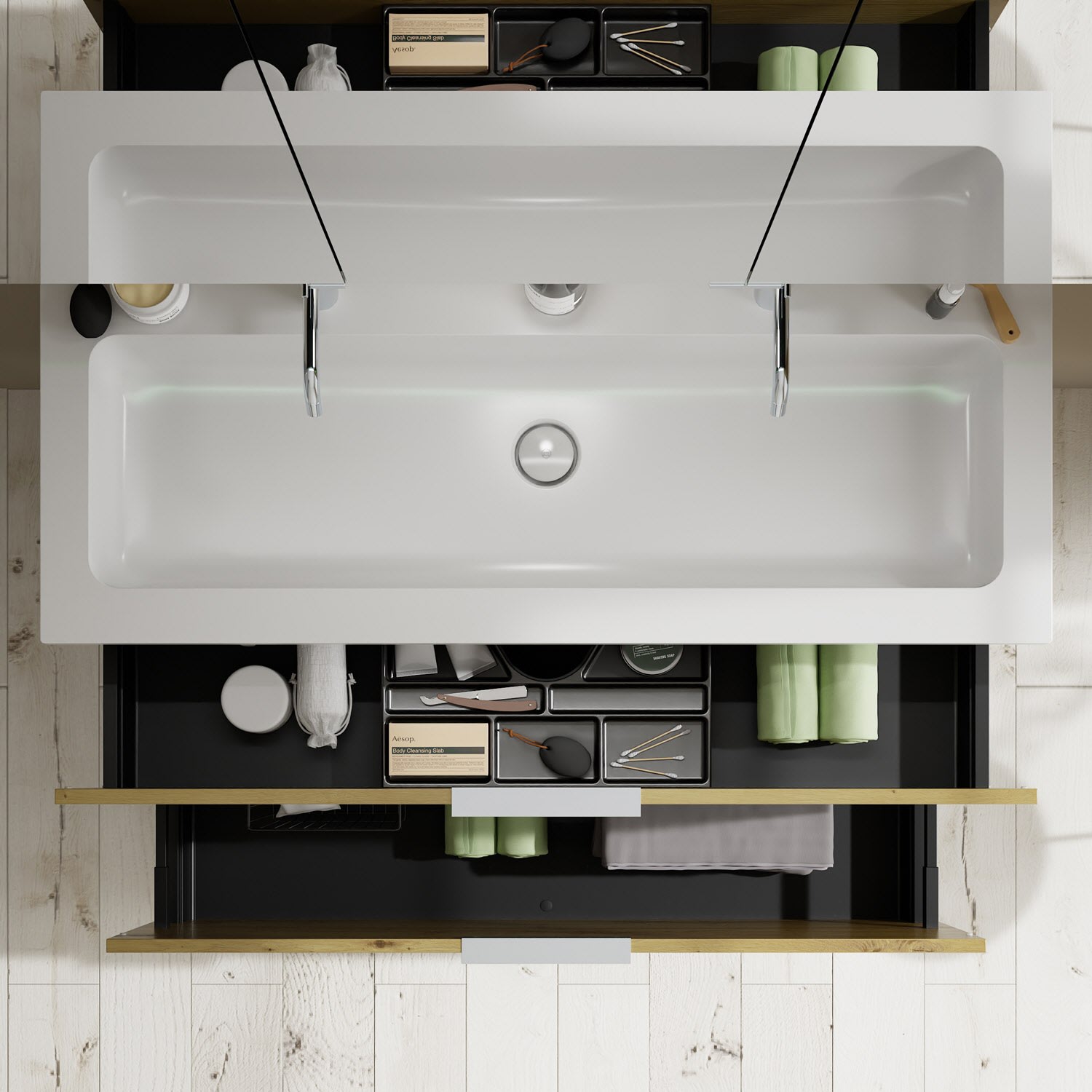 - 1 Schublade oben, 35 cm tief, mit Siphonausschnitt und Inneneinteilung