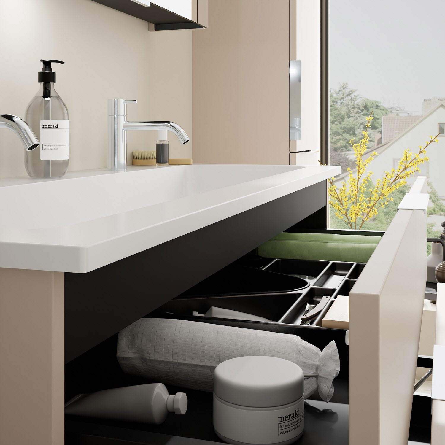 - 1 Schublade oben, 35 cm tief, mit Siphonausschnitt und Inneneinteilung
