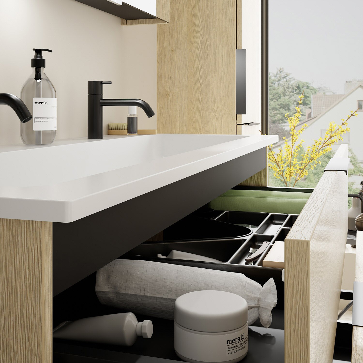 - 1 Schublade oben, 35 cm tief, mit Siphonausschnitt und Inneneinteilung