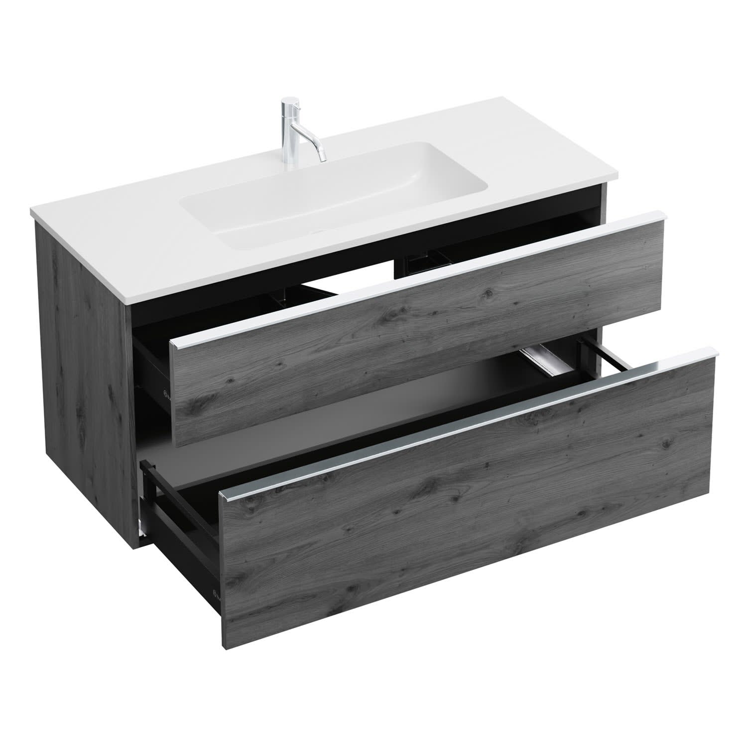 - 1 Schublade oben, 35 cm tief, mit Siphonausschnitt und Inneneinteilung