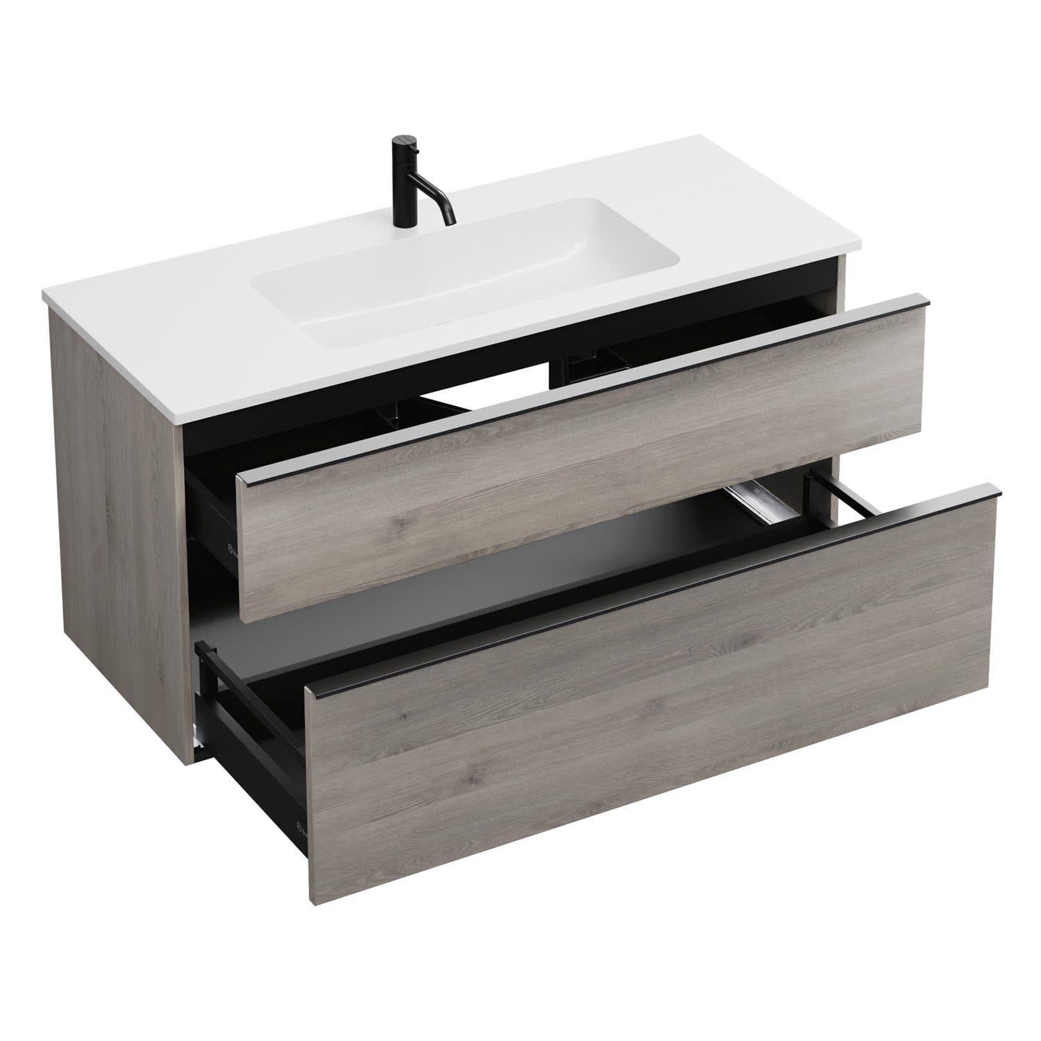 - 1 Schublade oben, 35 cm tief, mit Siphonausschnitt und Inneneinteilung
