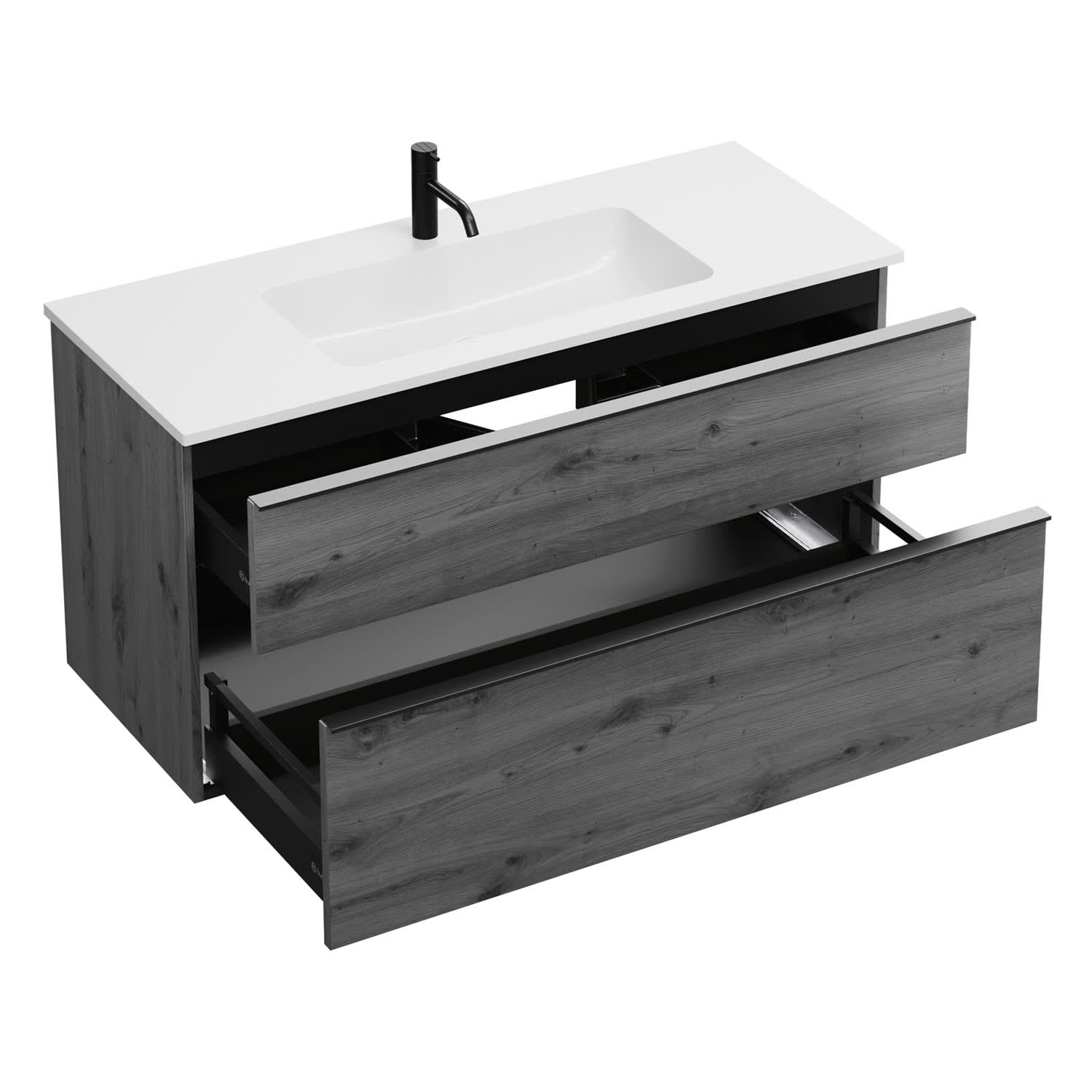 - 1 Schublade oben, 35 cm tief, mit Siphonausschnitt und Inneneinteilung