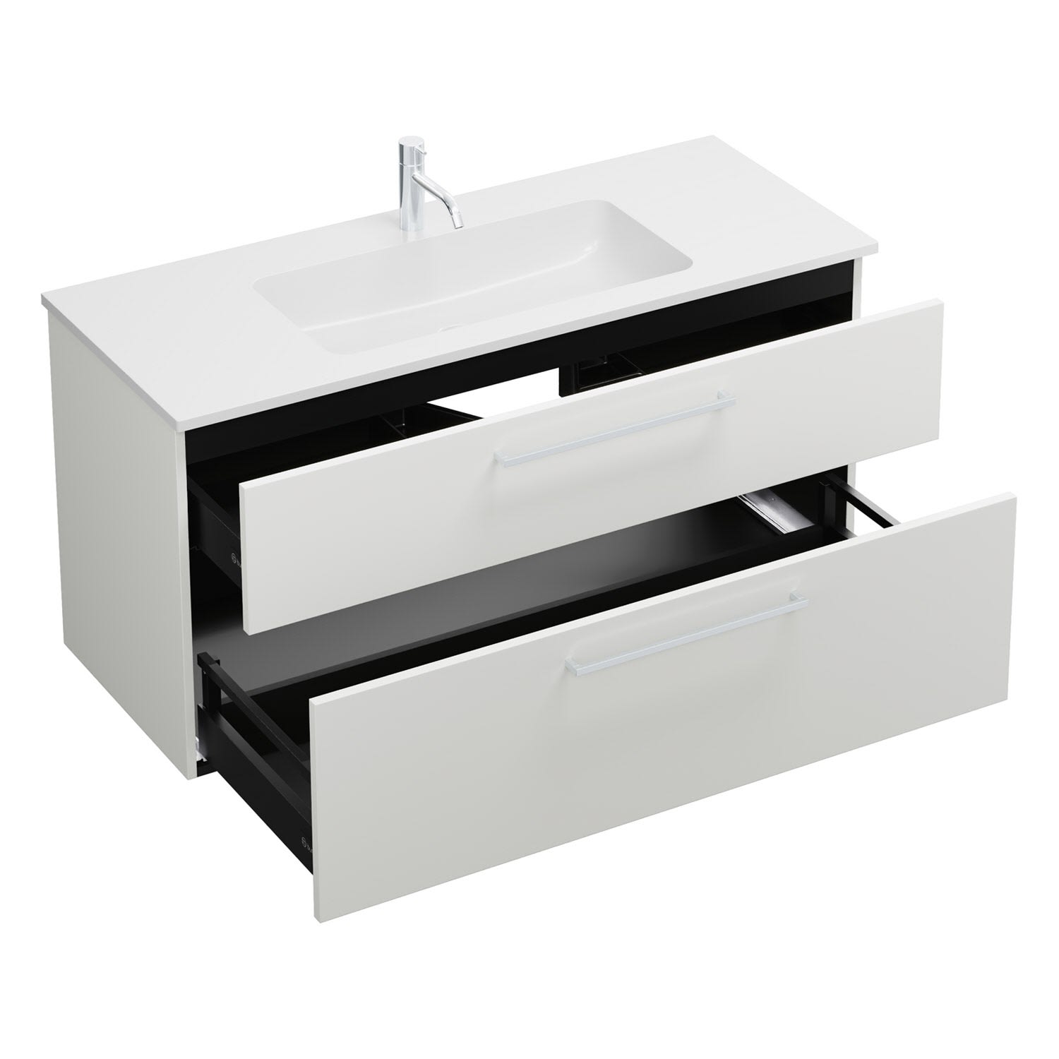 - 1 Schublade oben, 35 cm tief, mit Siphonausschnitt und Inneneinteilung