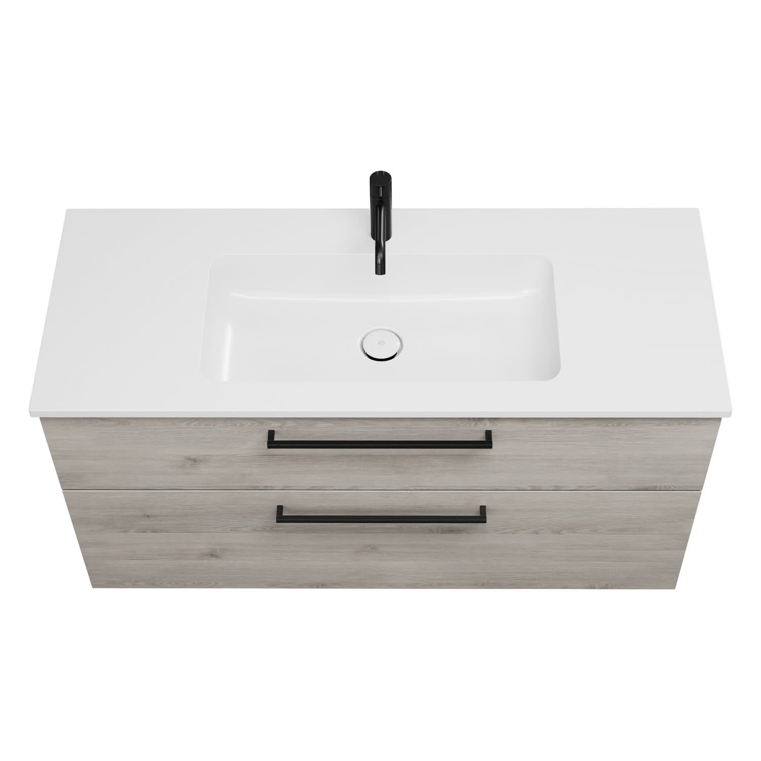 - 1 Schublade oben, 35 cm tief, mit Siphonausschnitt und Inneneinteilung