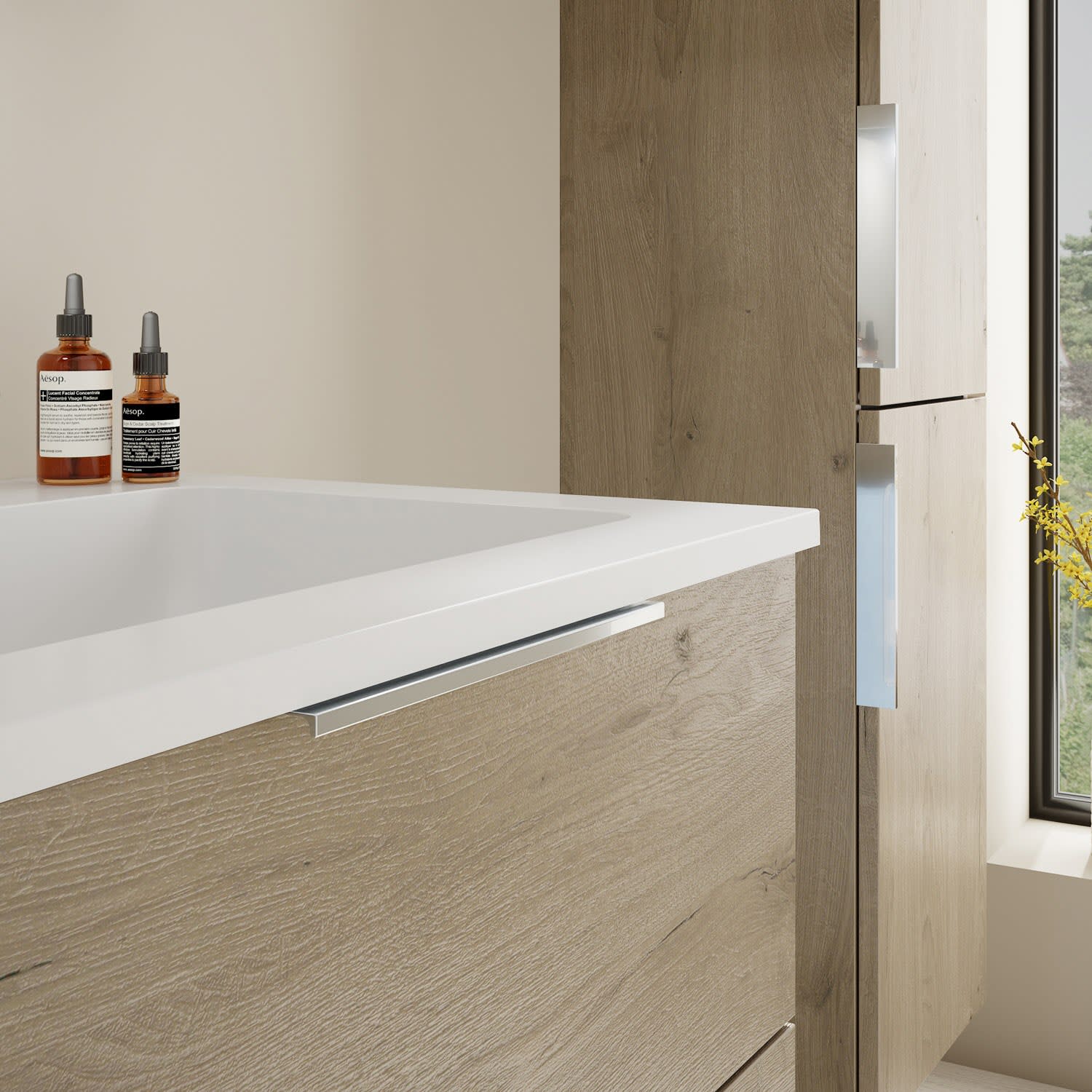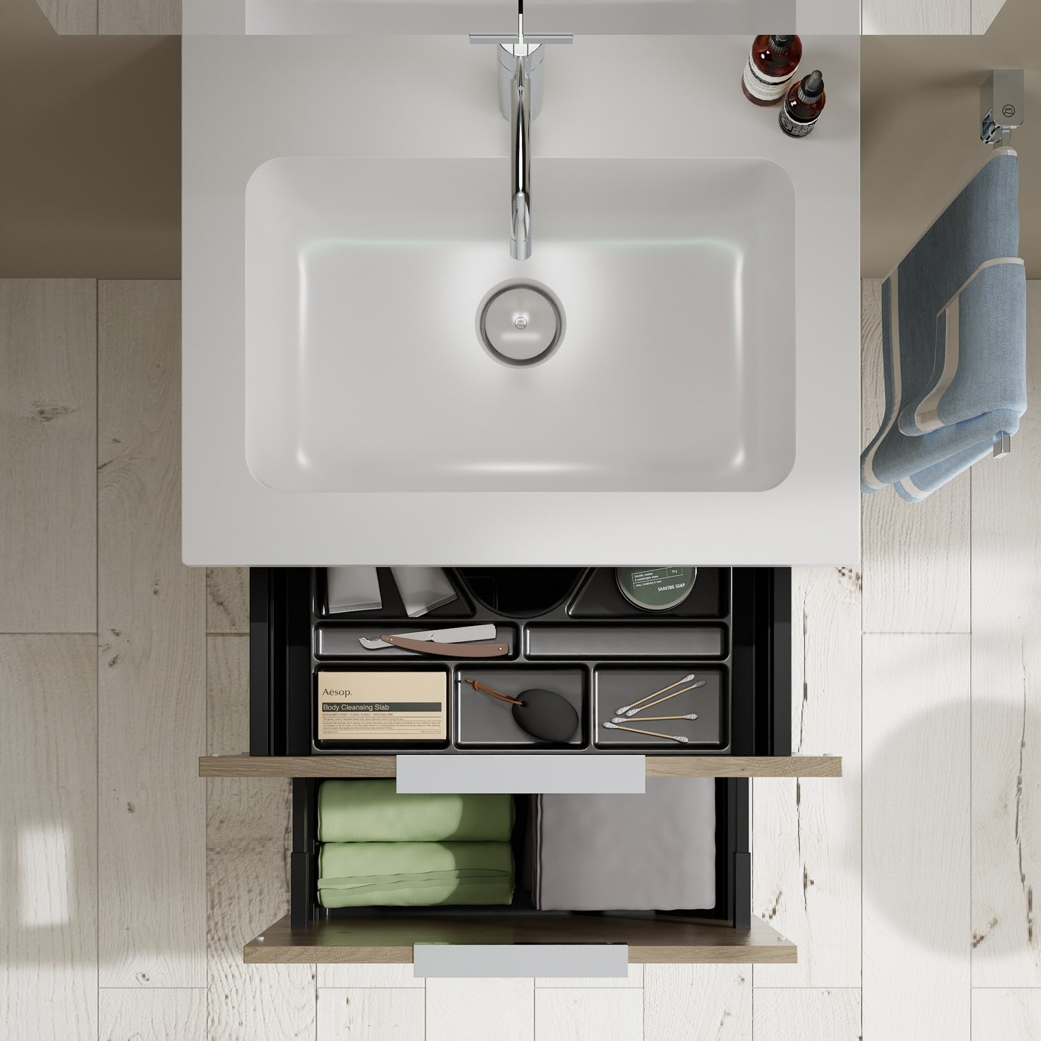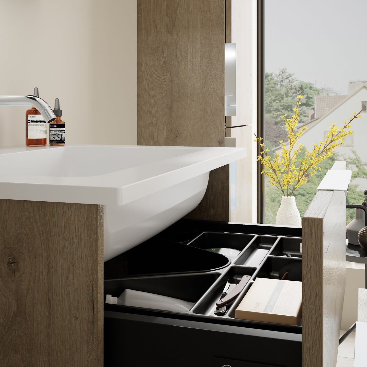 - 1 Schublade oben, 35 cm tief, mit Siphonausschnitt und Inneneinteilung