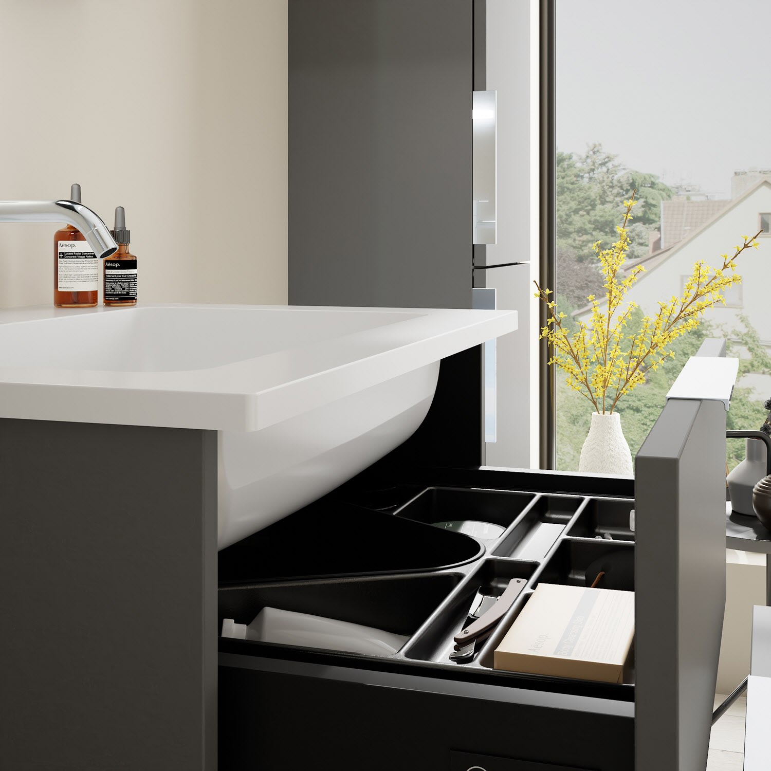 - 1 Schublade oben, 35 cm tief, mit Siphonausschnitt und Inneneinteilung