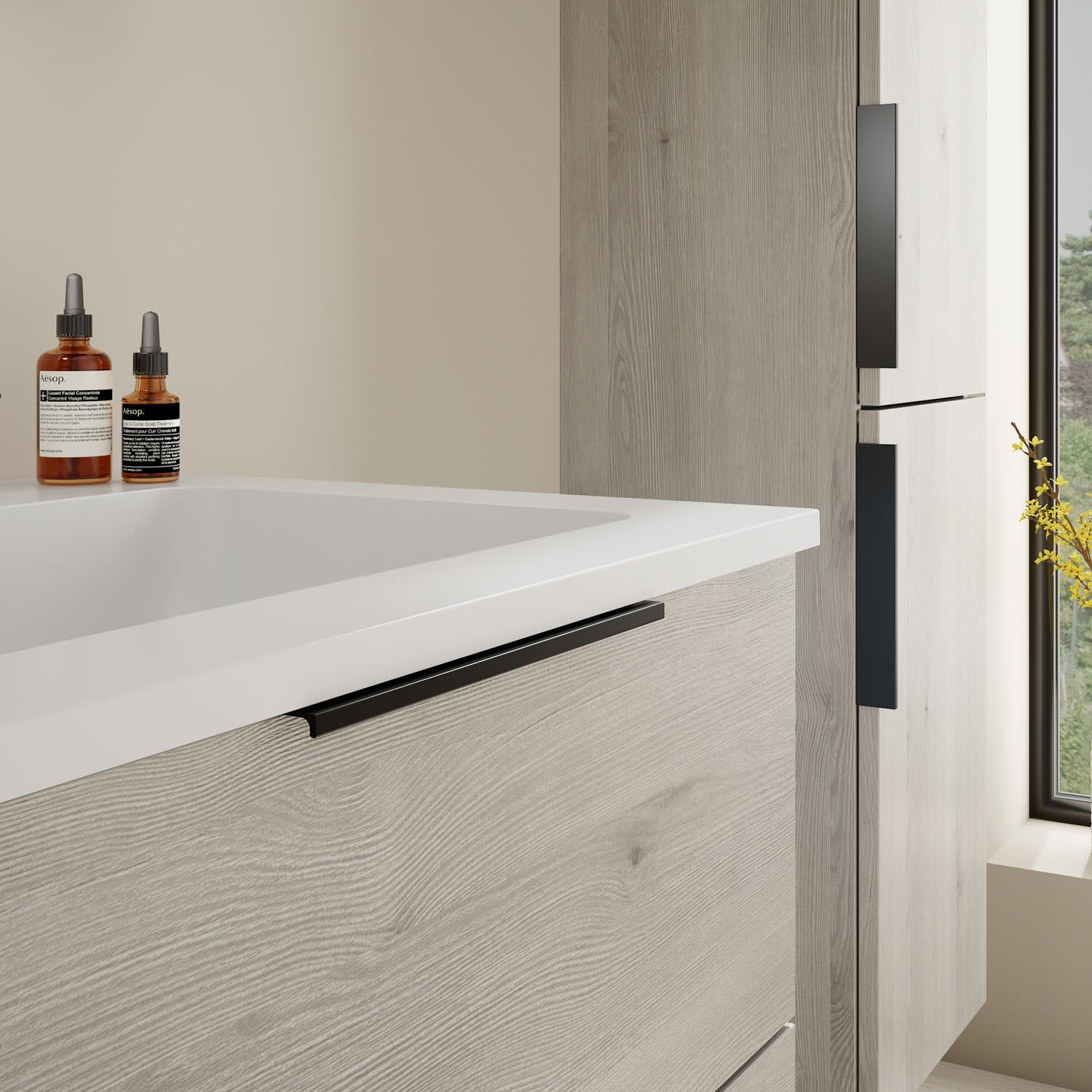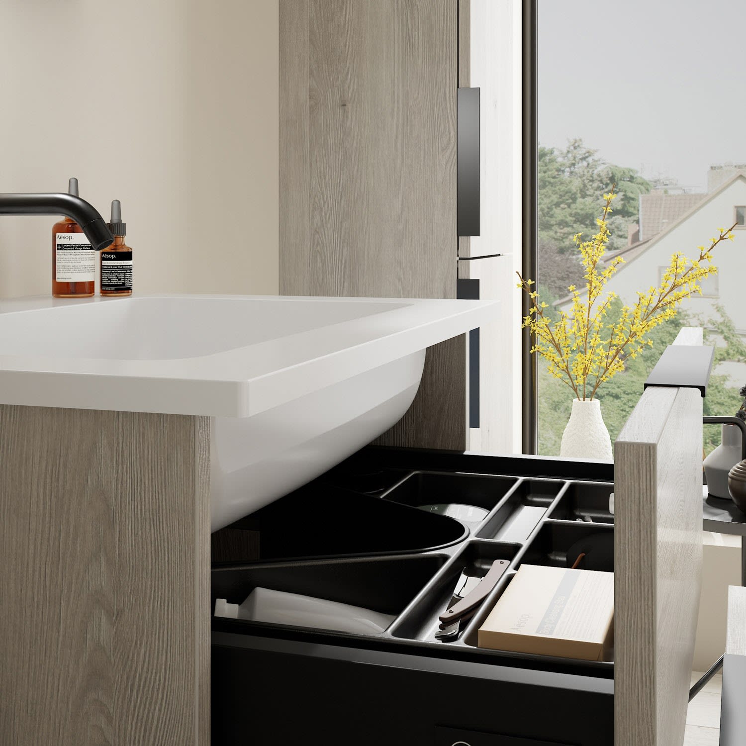- 1 Schublade oben, 35 cm tief, mit Siphonausschnitt und Inneneinteilung