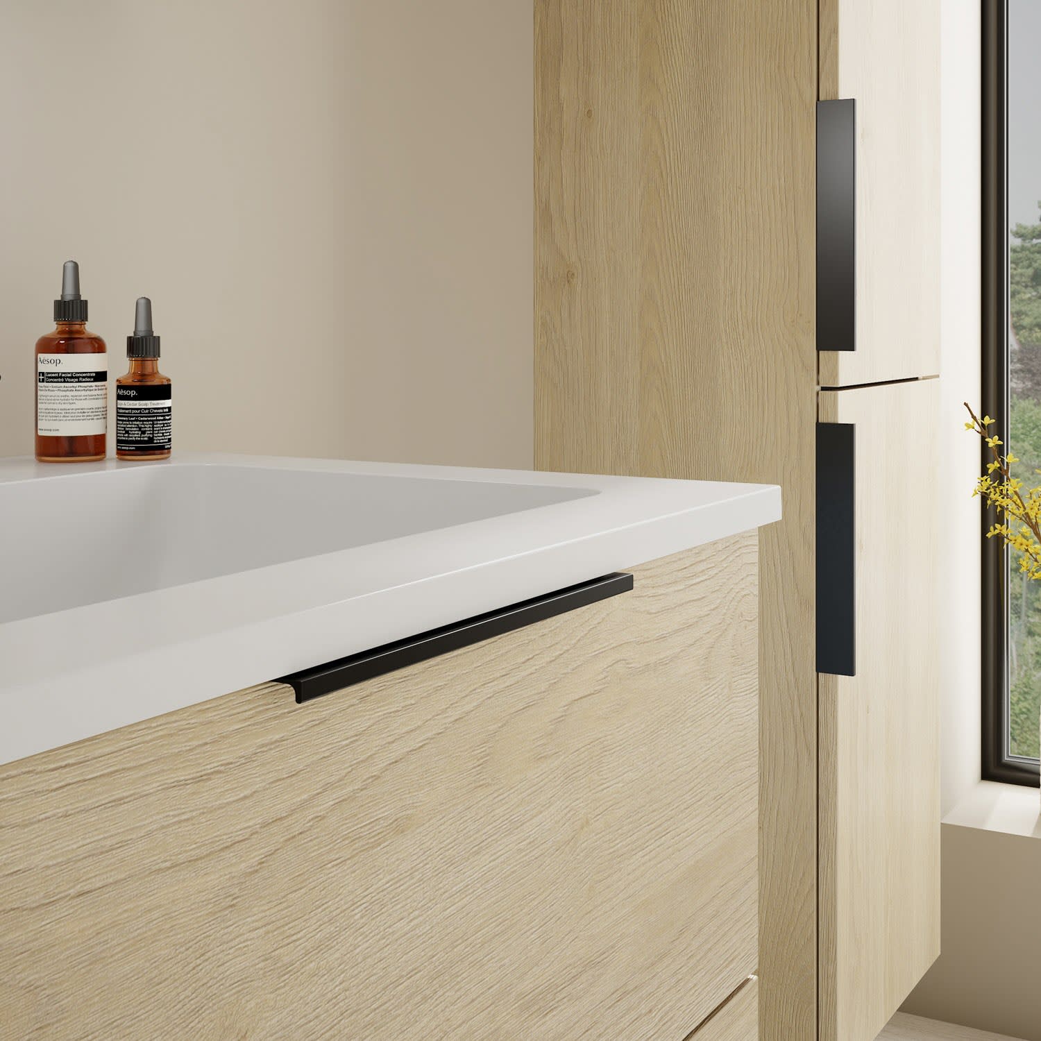- 1 Schublade oben, 35 cm tief, mit Siphonausschnitt und Inneneinteilung