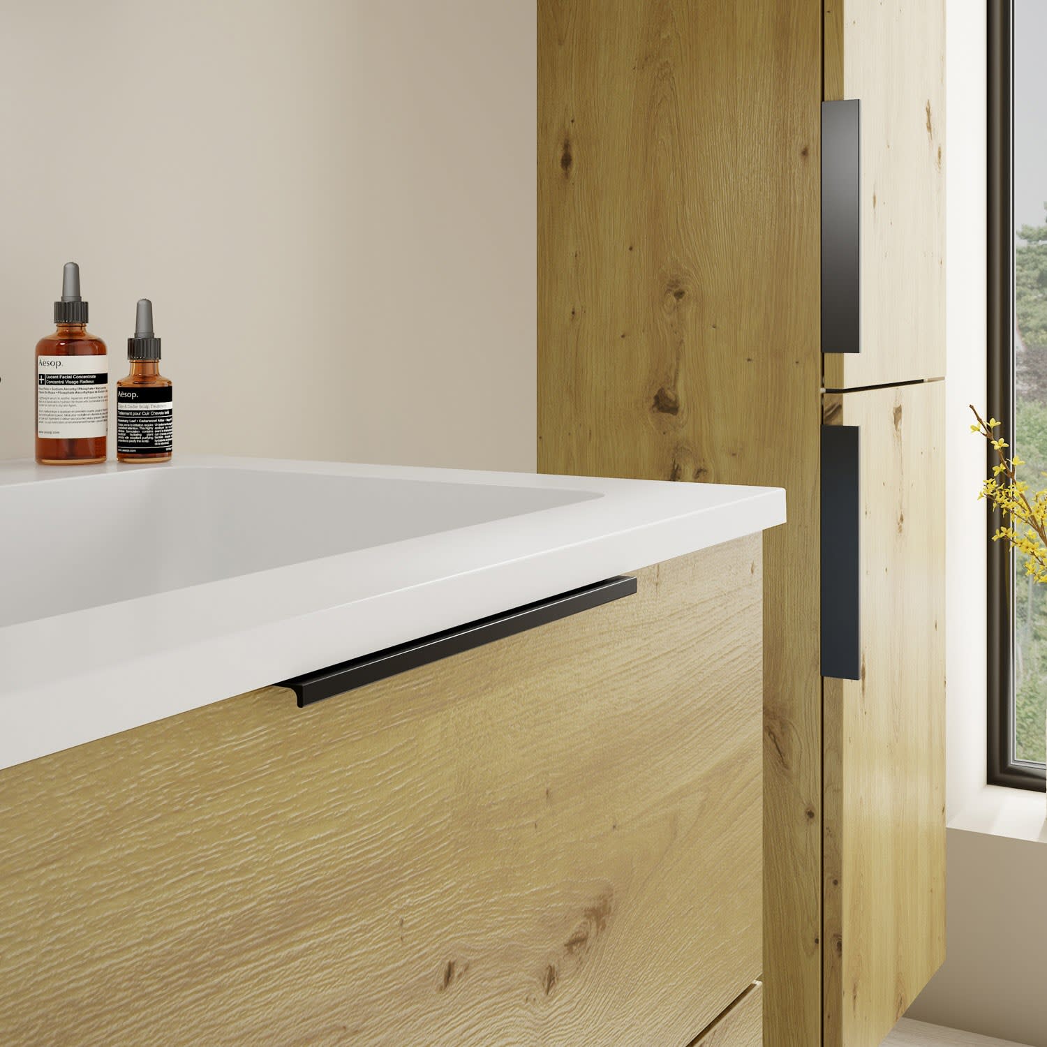 - 1 Schublade oben, 35 cm tief, mit Siphonausschnitt und Inneneinteilung
