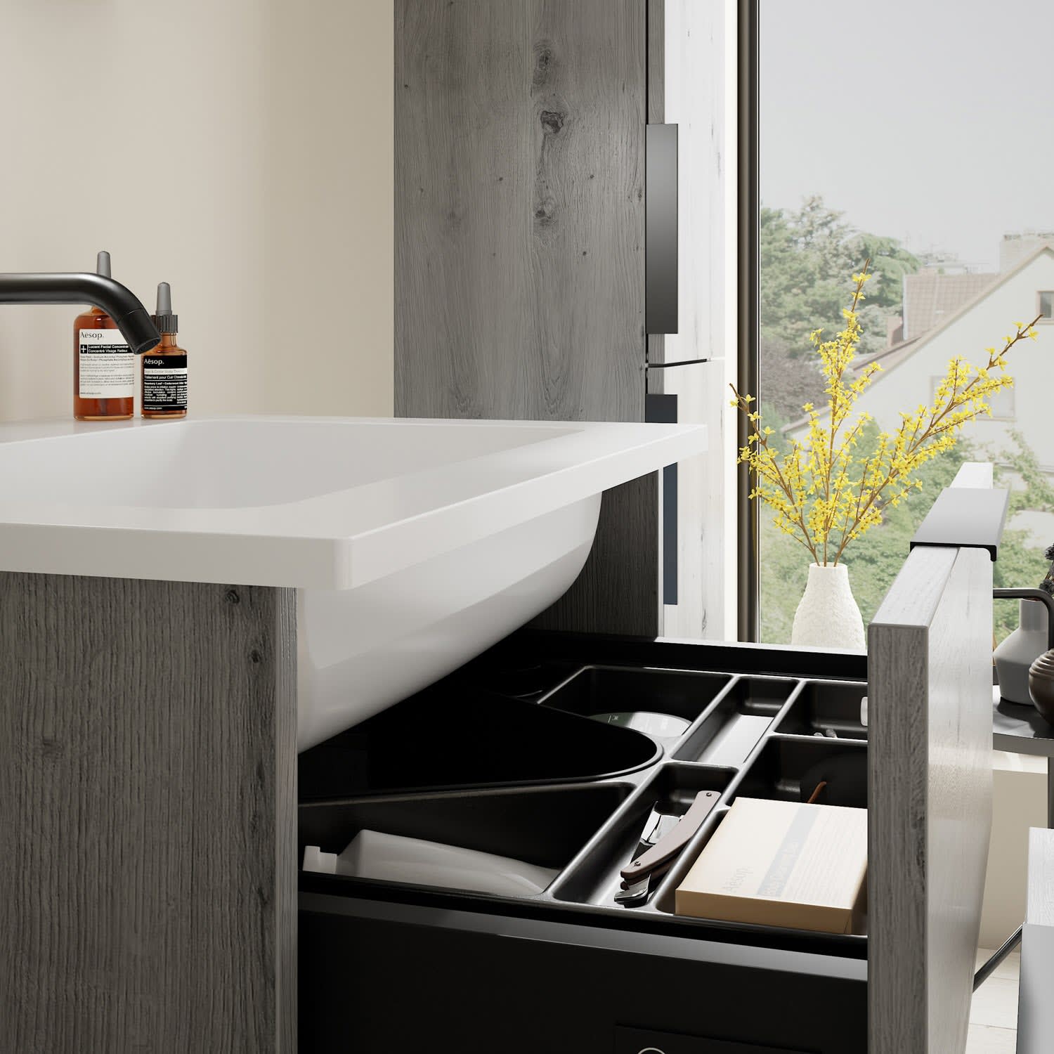 - 1 Schublade oben, 35 cm tief, mit Siphonausschnitt und Inneneinteilung