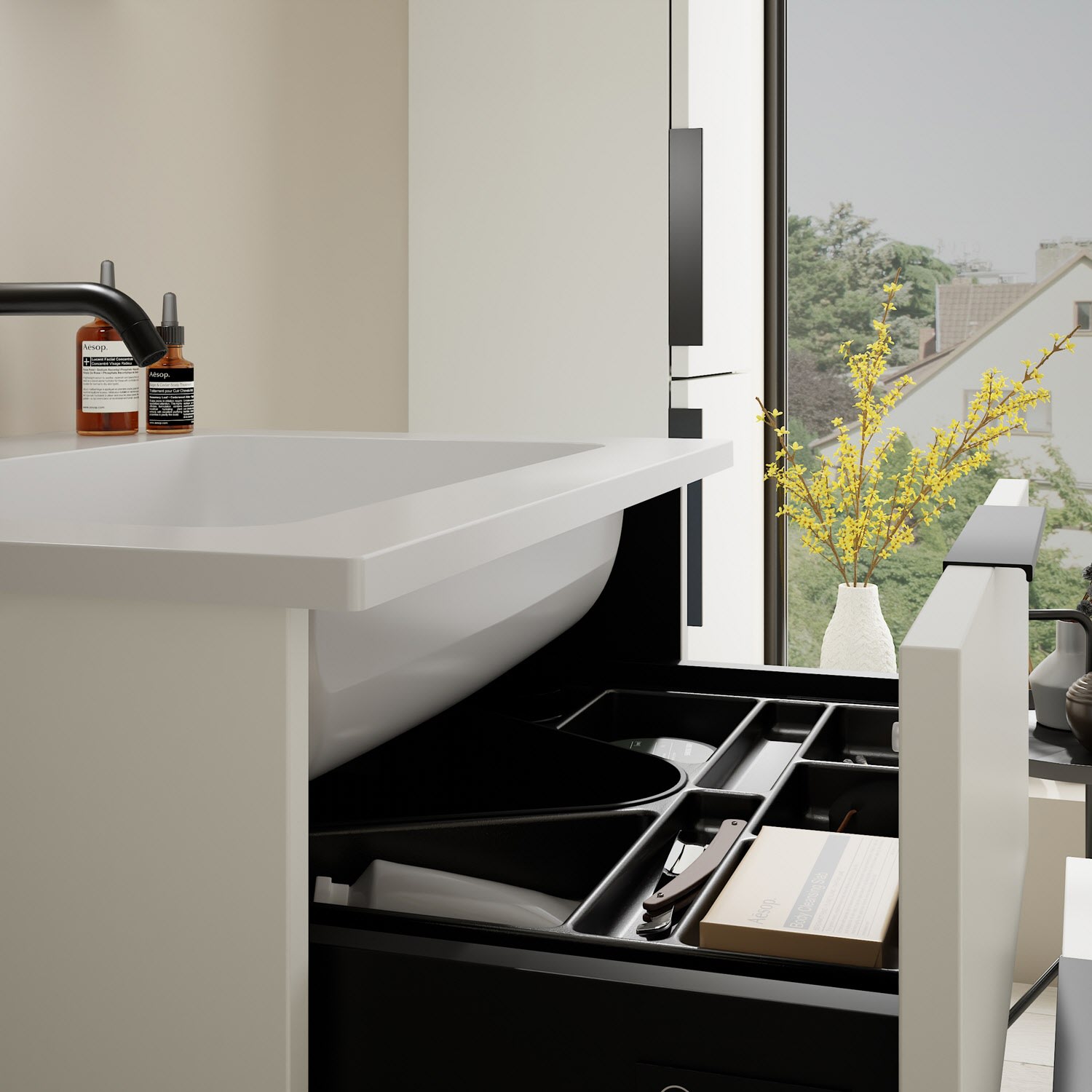 - 1 Schublade oben, 35 cm tief, mit Siphonausschnitt und Inneneinteilung