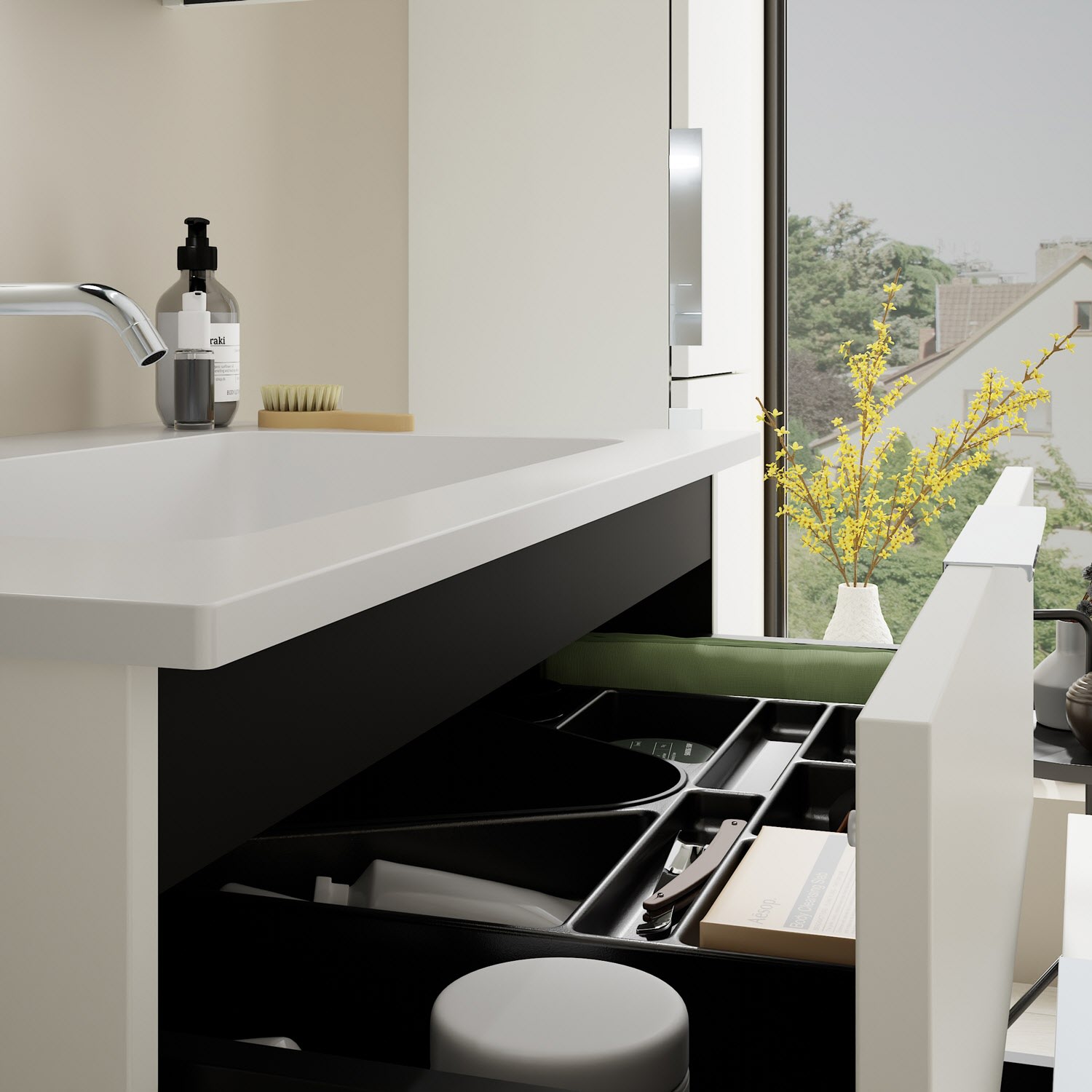 - 1 Schublade oben, 35 cm tief, mit Siphonausschnitt und Inneneinteilung