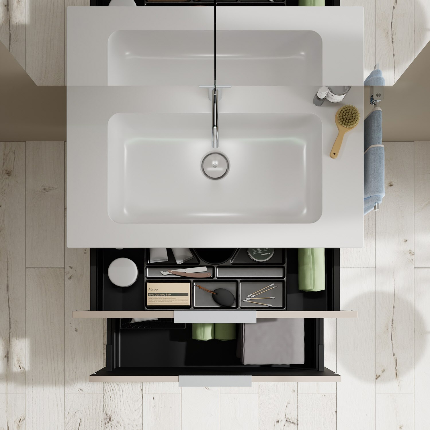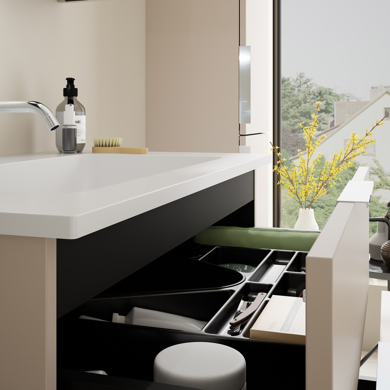 - 1 Schublade oben, 35 cm tief, mit Siphonausschnitt und Inneneinteilung
