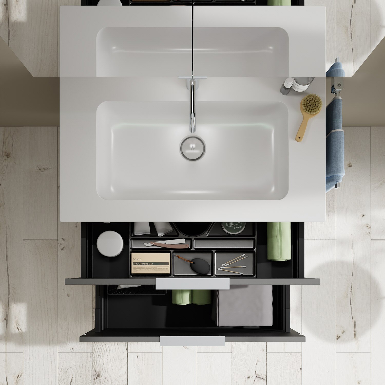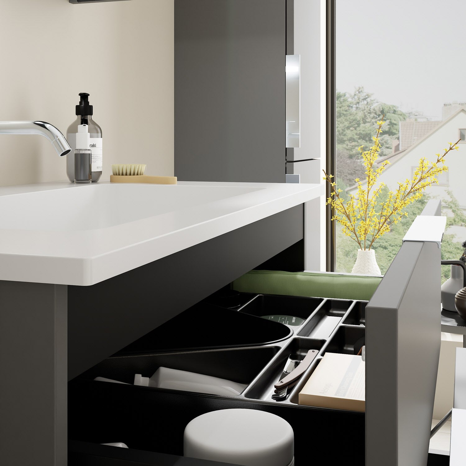 - 1 Schublade oben, 35 cm tief, mit Siphonausschnitt und Inneneinteilung