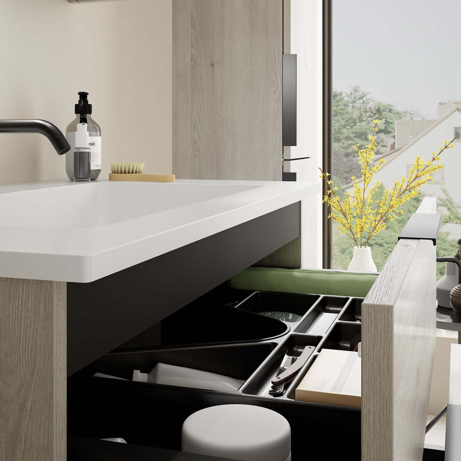 - 1 Schublade oben, 35 cm tief, mit Siphonausschnitt und Inneneinteilung