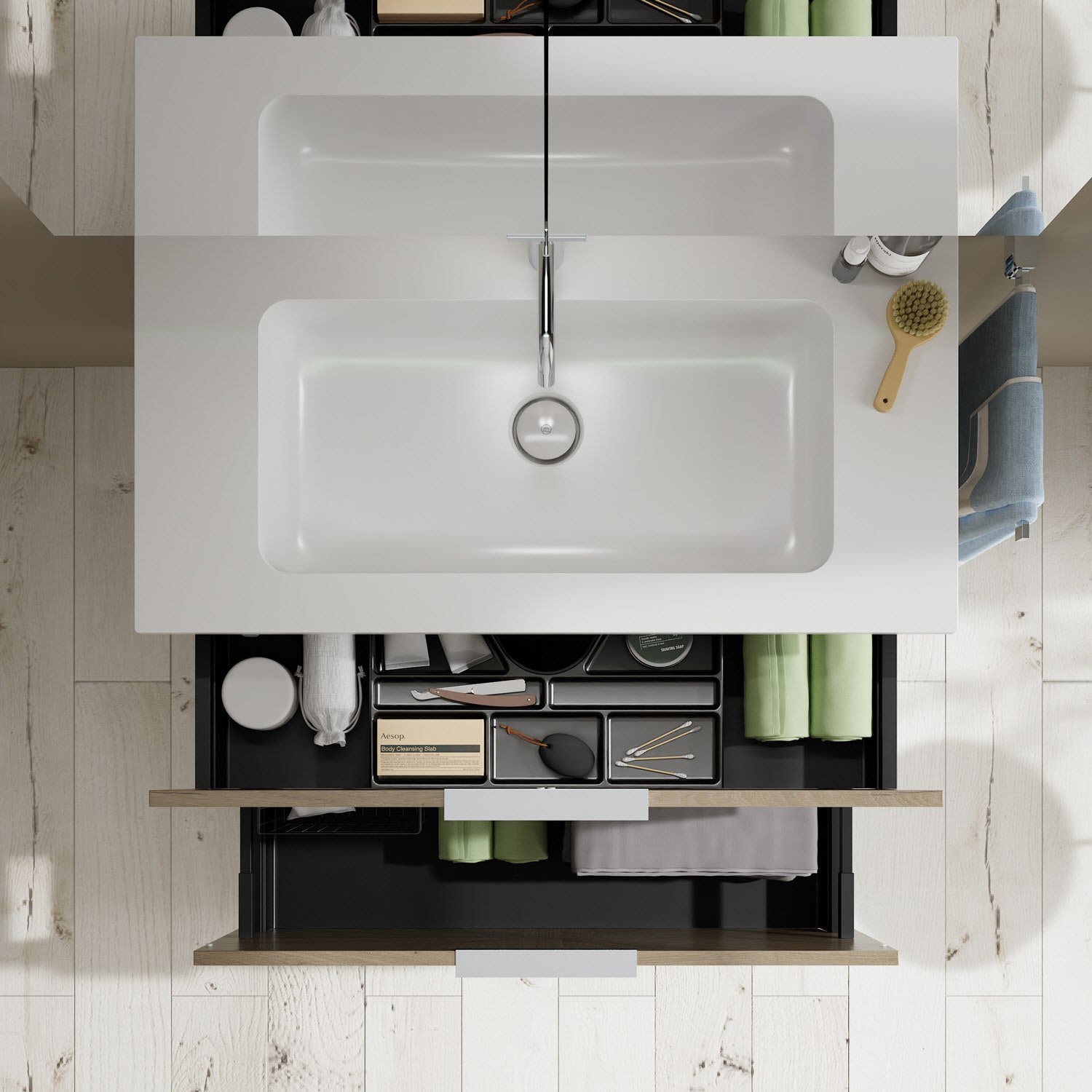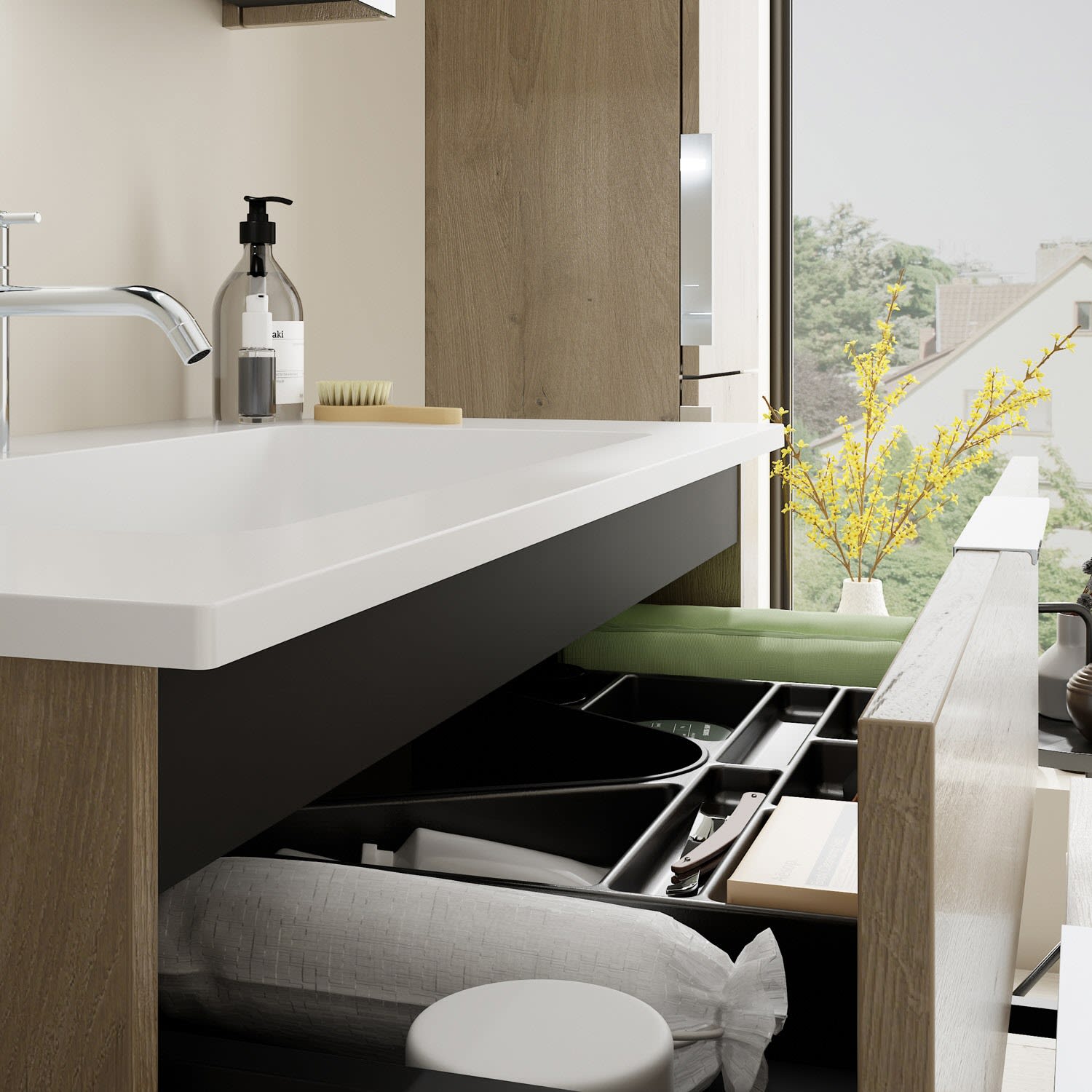 - 1 Schublade oben, 35 cm tief, mit Siphonausschnitt und Inneneinteilung