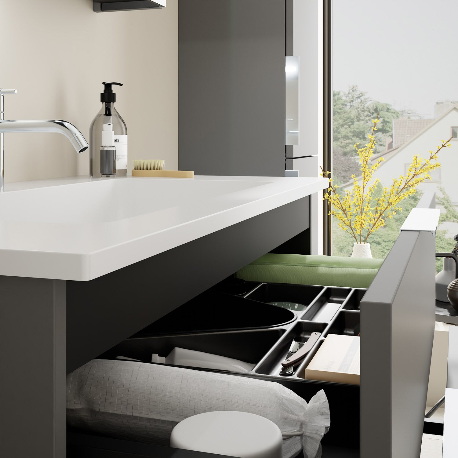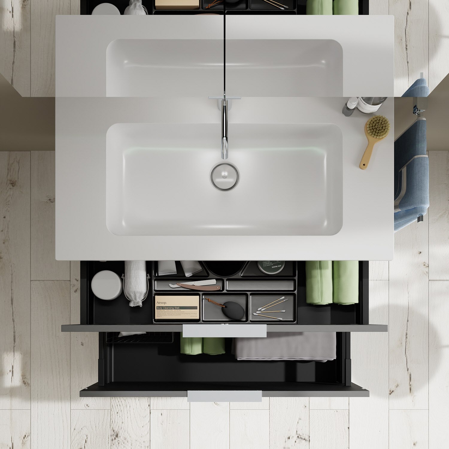 - 1 Schublade oben, 35 cm tief, mit Siphonausschnitt und Inneneinteilung
