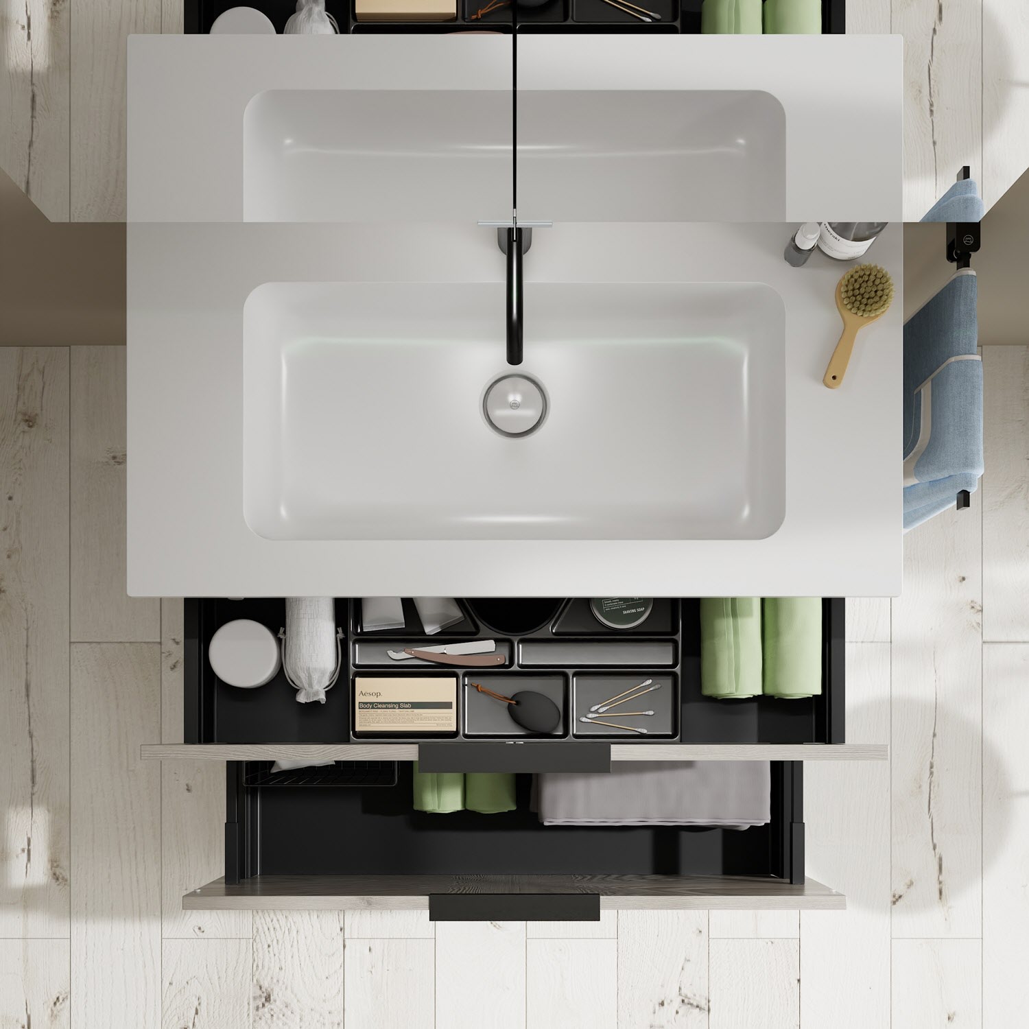 - 1 Schublade oben, 35 cm tief, mit Siphonausschnitt und Inneneinteilung