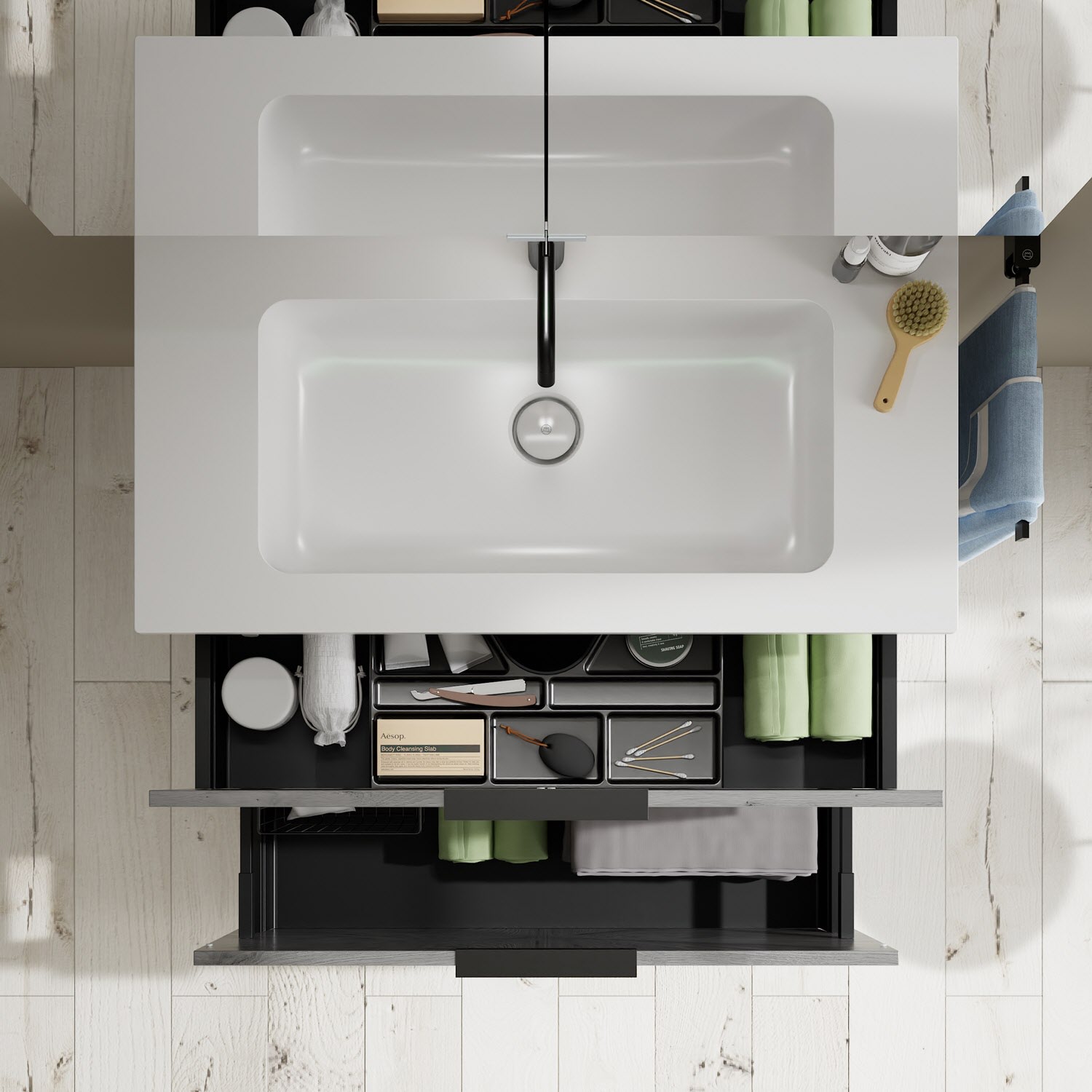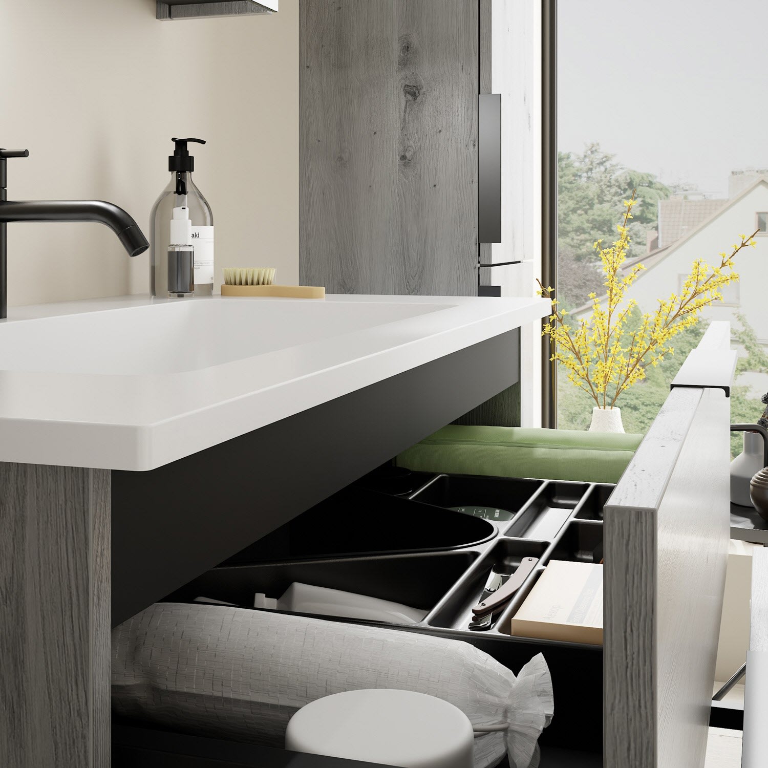 - 1 Schublade oben, 35 cm tief, mit Siphonausschnitt und Inneneinteilung