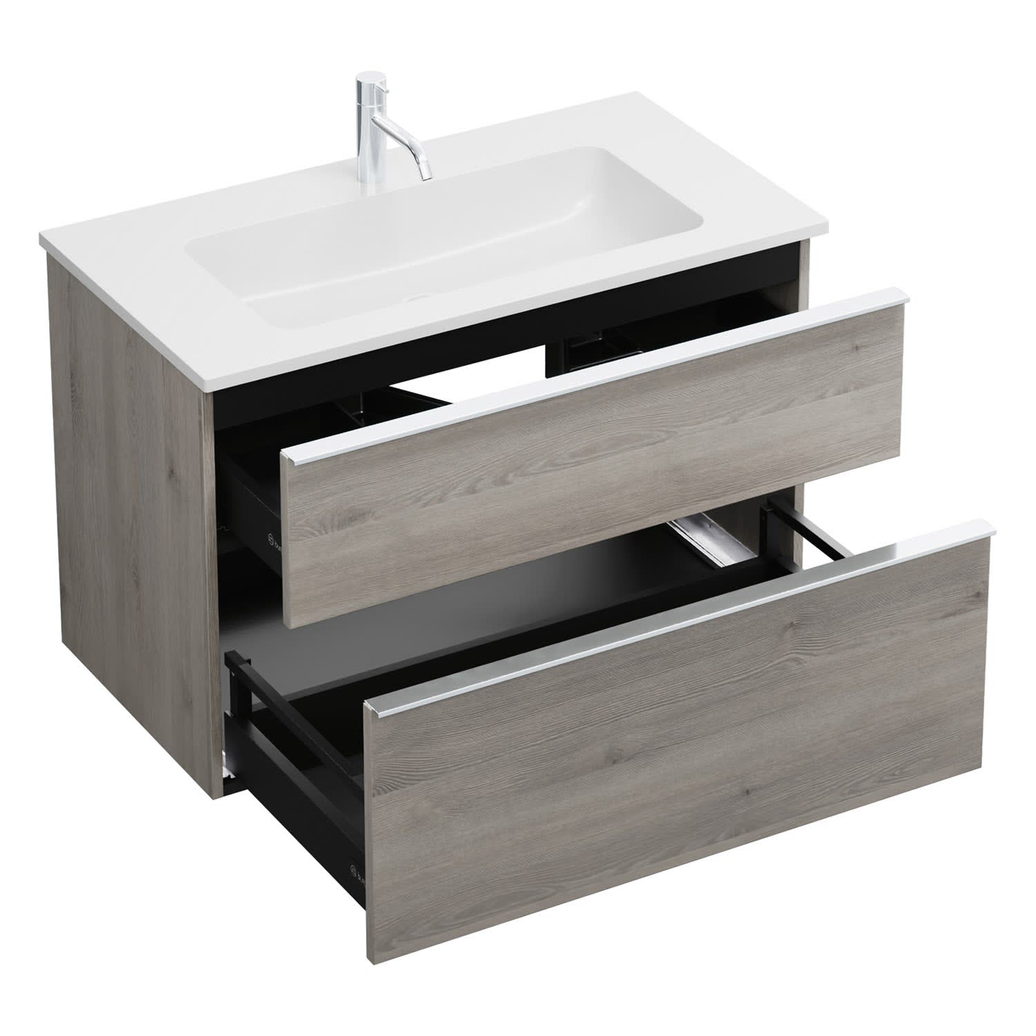 - 1 Schublade oben, 35 cm tief, mit Siphonausschnitt und Inneneinteilung