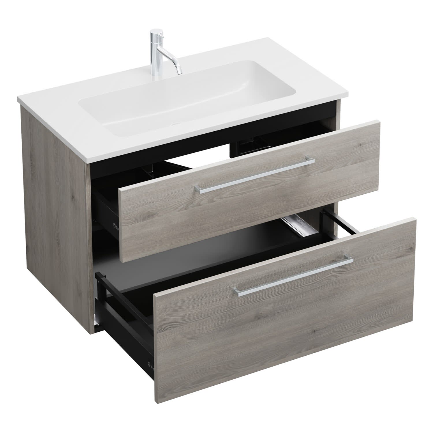 - 1 Schublade oben, 35 cm tief, mit Siphonausschnitt und Inneneinteilung