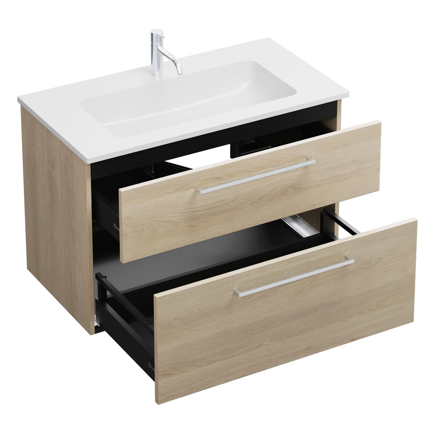 - 1 Schublade oben, 35 cm tief, mit Siphonausschnitt und Inneneinteilung
