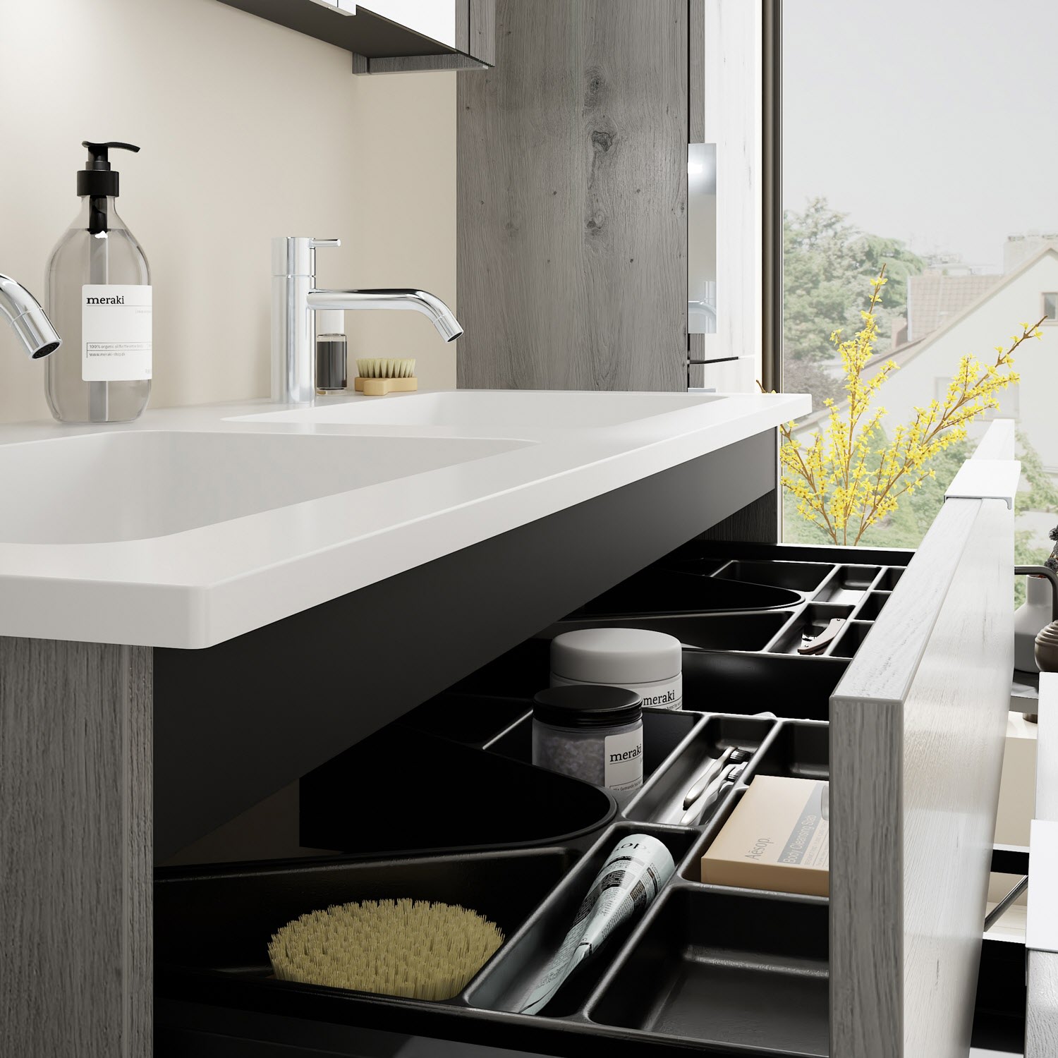 - 1 Schublade oben, 35 cm tief, mit 2 Siphonausschnitten und Inneneinteilung