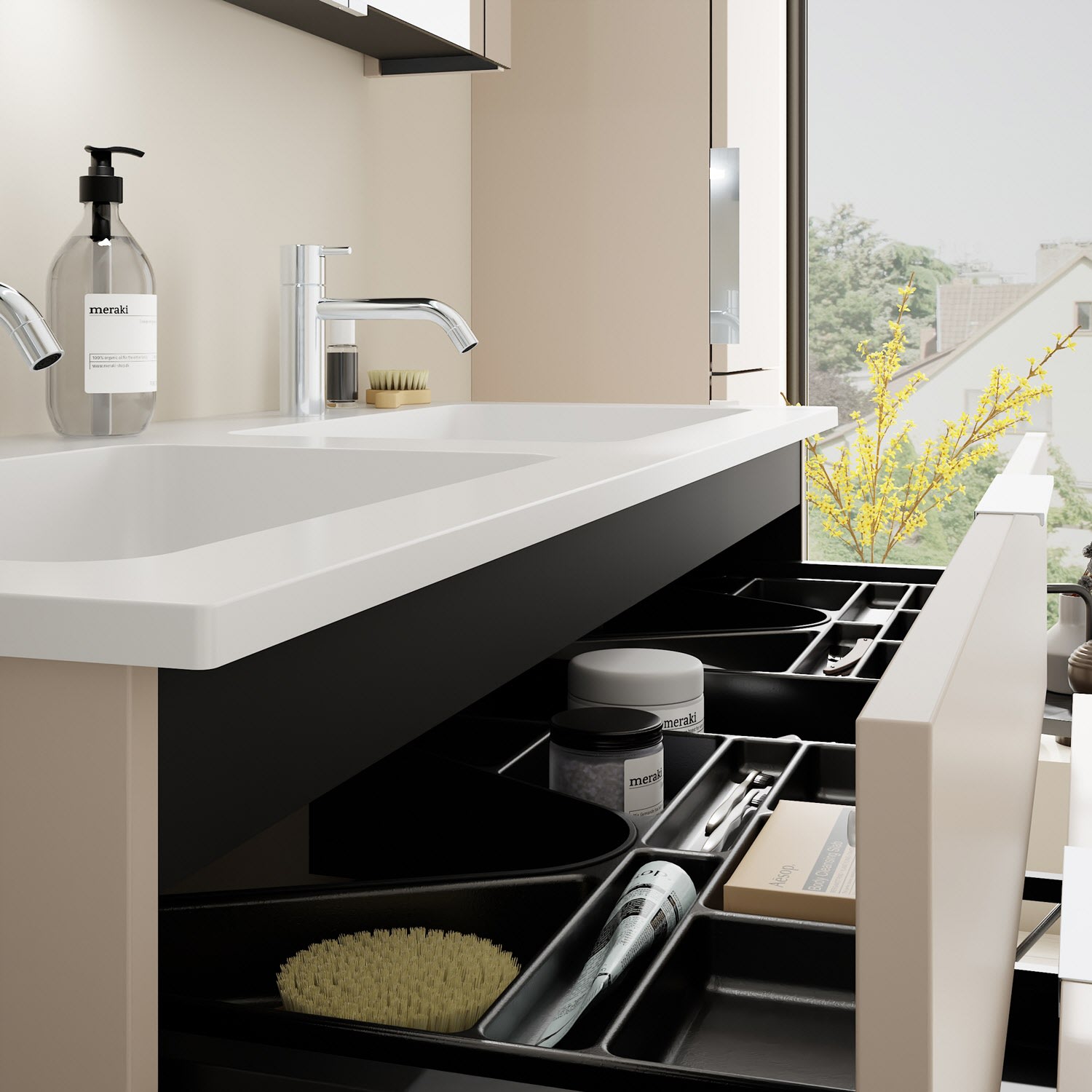 - 1 Schublade oben, 35 cm tief, mit 2 Siphonausschnitten und Inneneinteilung