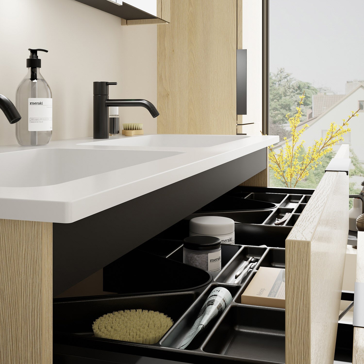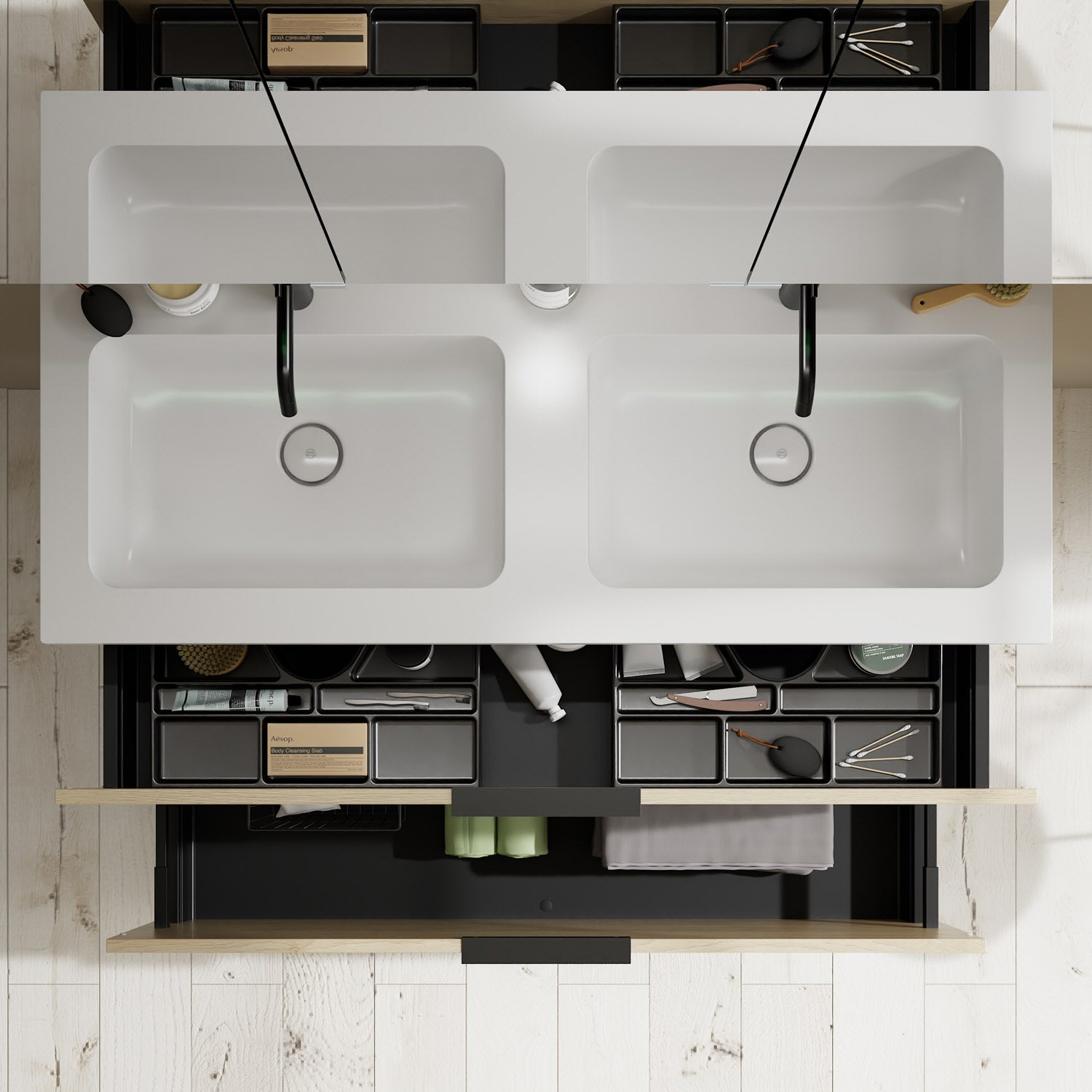 - 1 Schublade oben, 35 cm tief, mit 2 Siphonausschnitten und Inneneinteilung