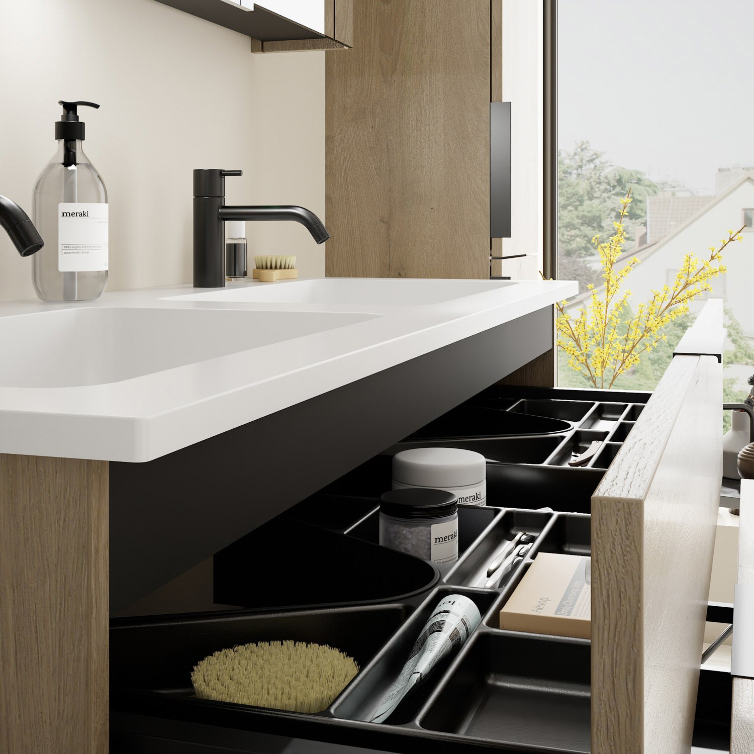- 1 Schublade oben, 35 cm tief, mit 2 Siphonausschnitten und Inneneinteilung