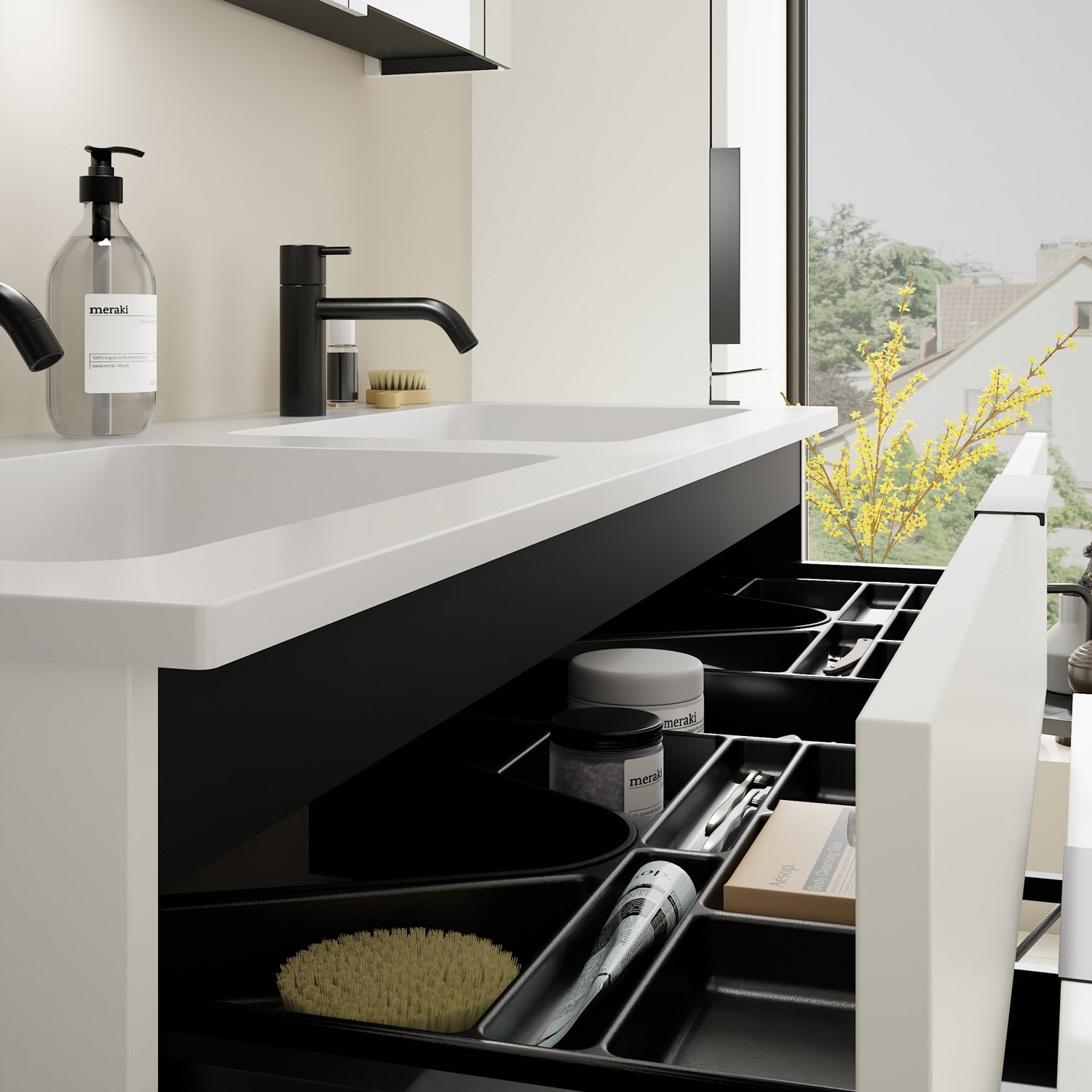- 1 Schublade oben, 35 cm tief, mit 2 Siphonausschnitten und Inneneinteilung