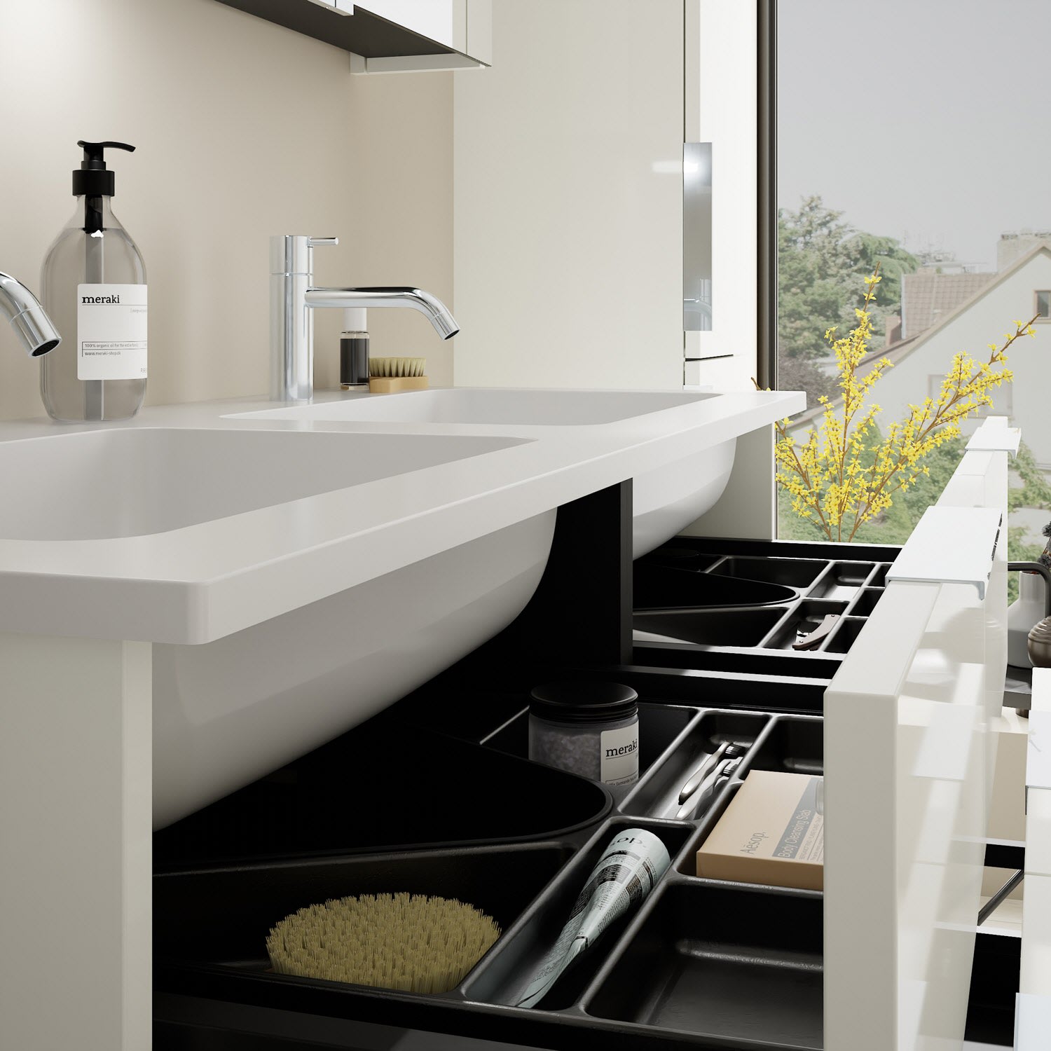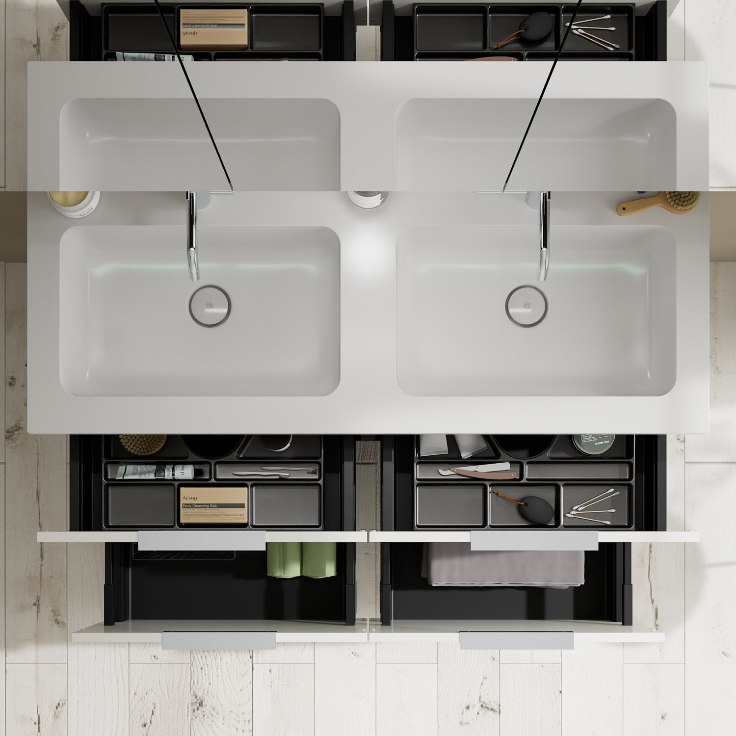 - 2 Schubladen oben, 35 cm tief, mit Siphonausschnitt und Inneneinteilung