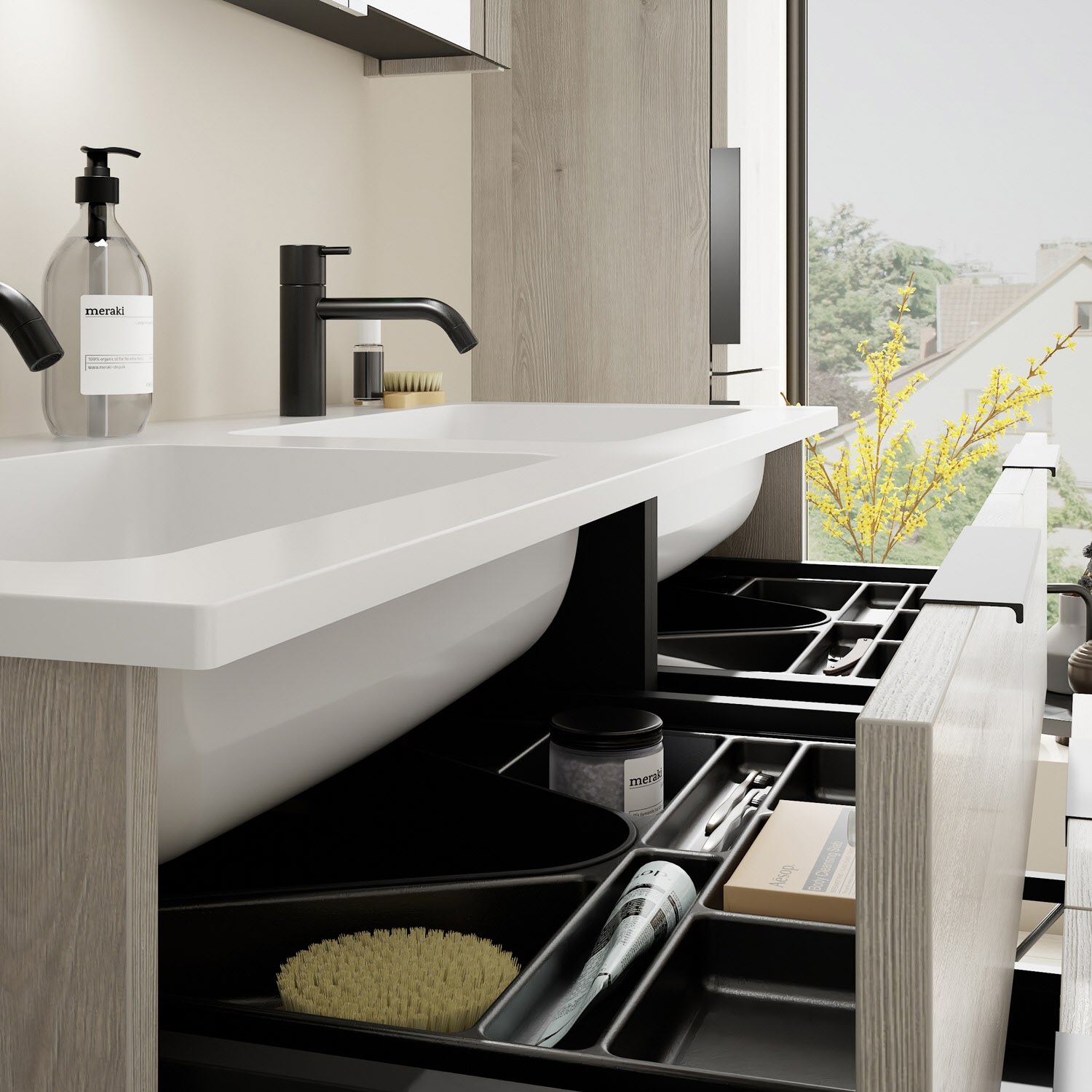- 2 Schubladen oben, 35 cm tief, mit Siphonausschnitt und Inneneinteilung