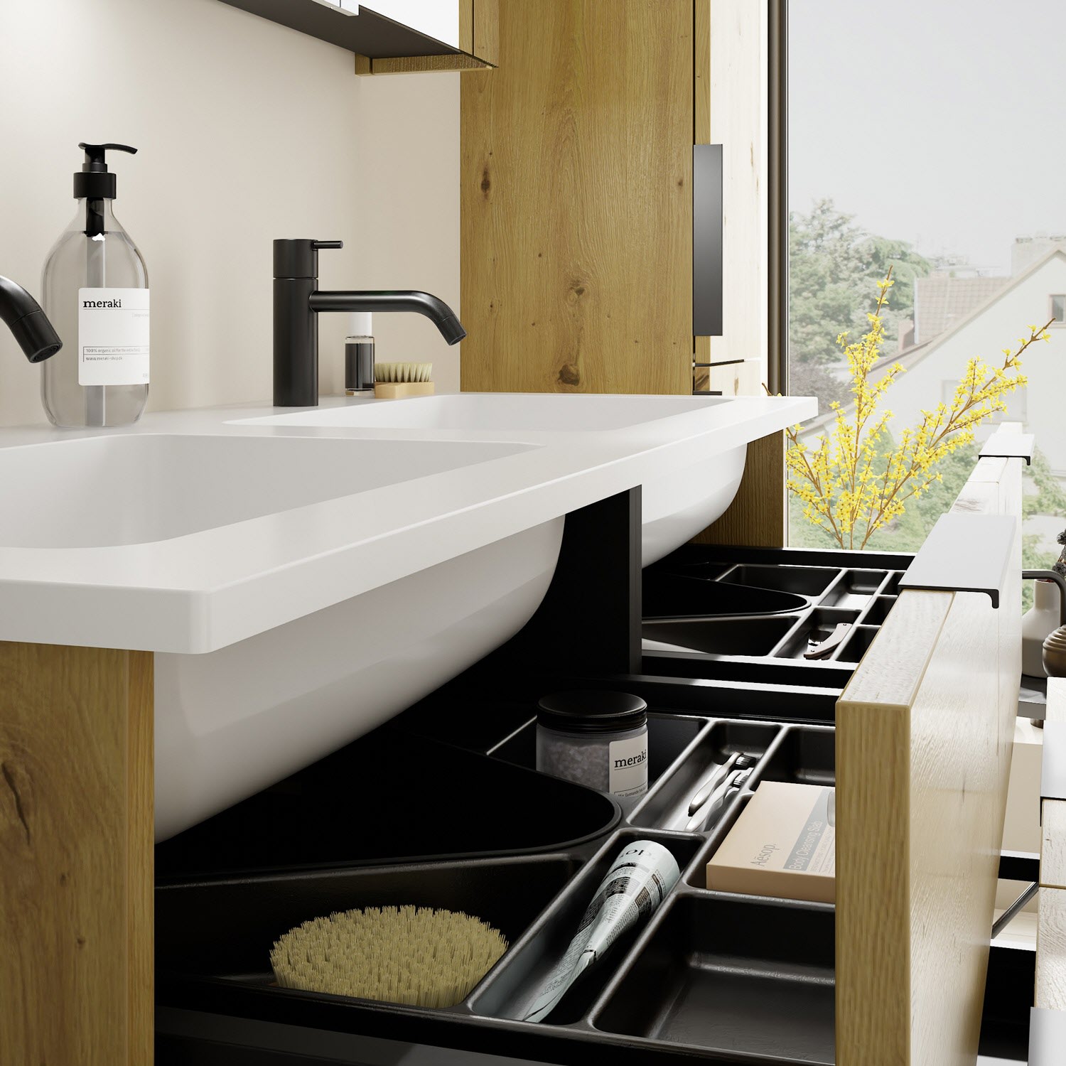 - 2 Schubladen oben, 35 cm tief, mit Siphonausschnitt und Inneneinteilung