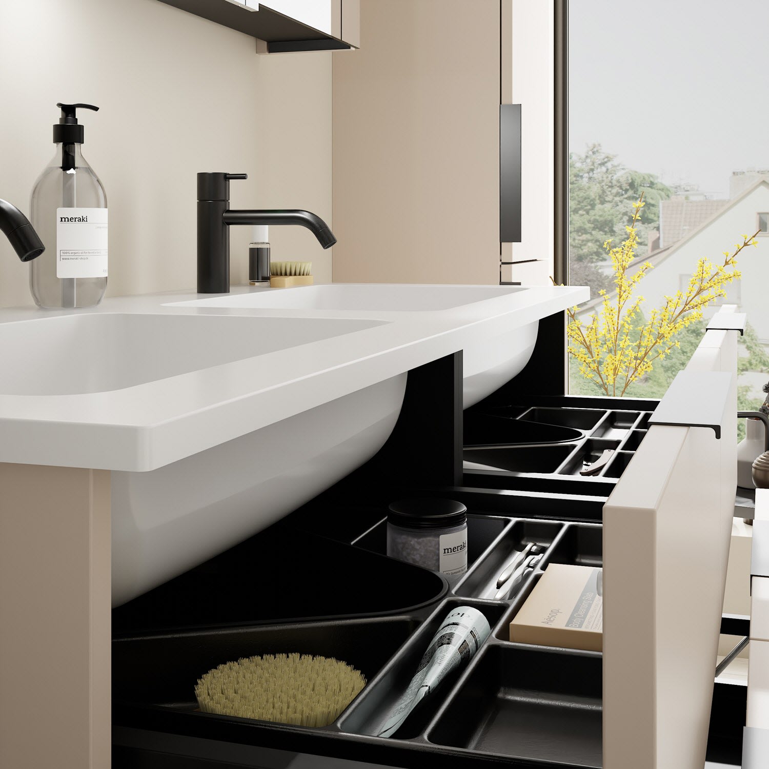 - 2 Schubladen oben, 35 cm tief, mit Siphonausschnitt und Inneneinteilung