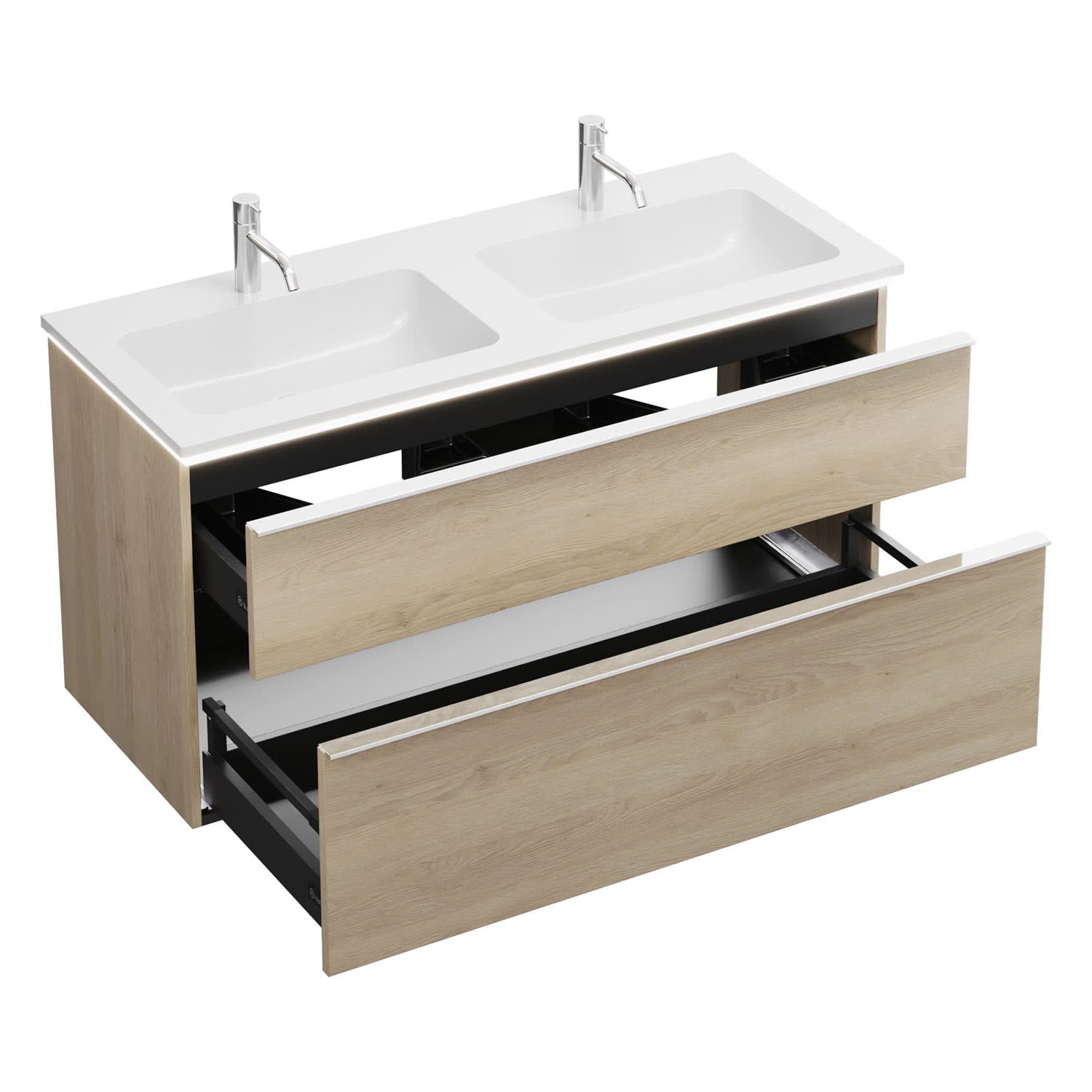 - 1 Schublade oben, 35 cm tief, mit 2 Siphonausschnitten und Inneneinteilung