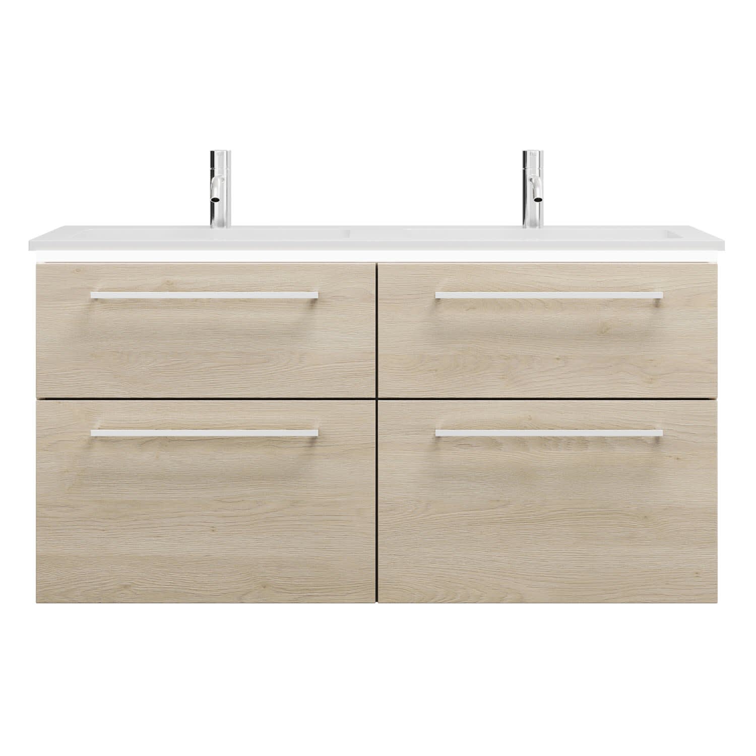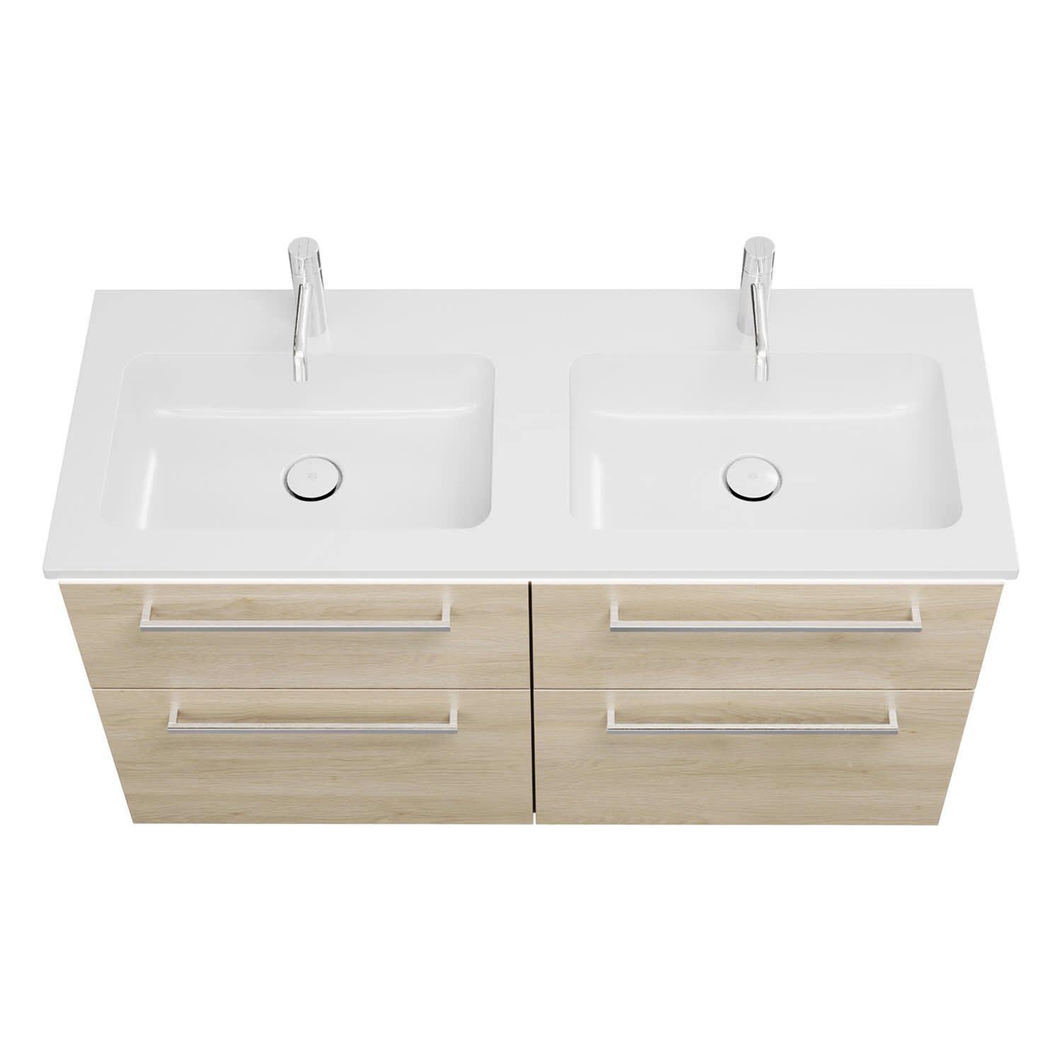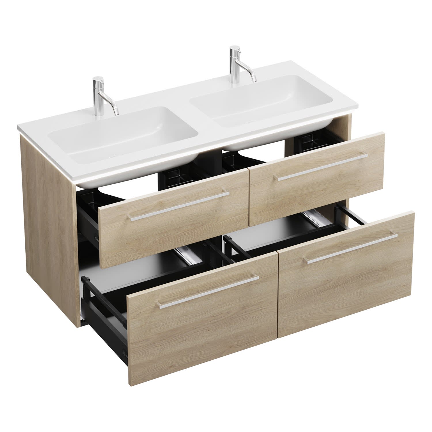 - 2 Schubladen oben, 35 cm tief, mit Siphonausschnitt und Inneneinteilung