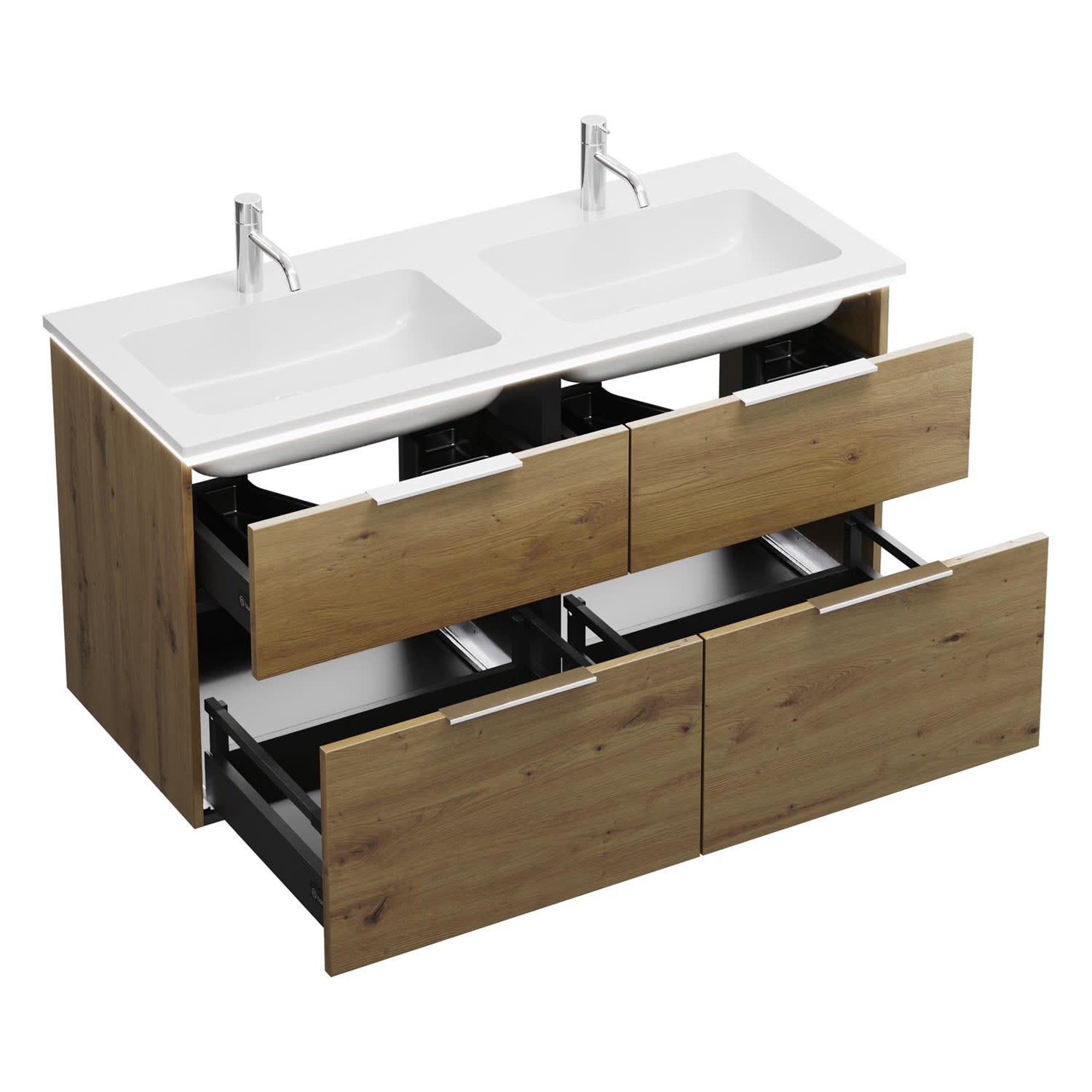 - 2 Schubladen oben, 35 cm tief, mit Siphonausschnitt und Inneneinteilung