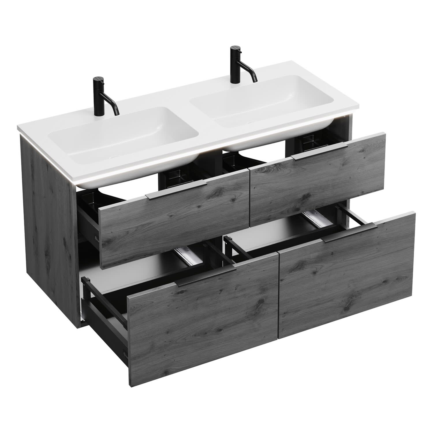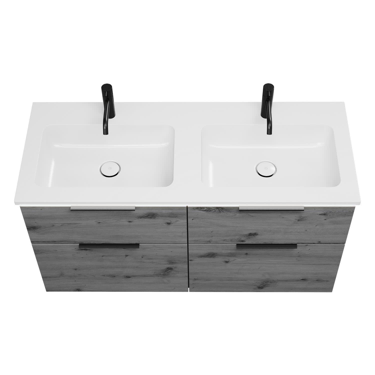 - 2 Schubladen oben, 35 cm tief, mit Siphonausschnitt und Inneneinteilung