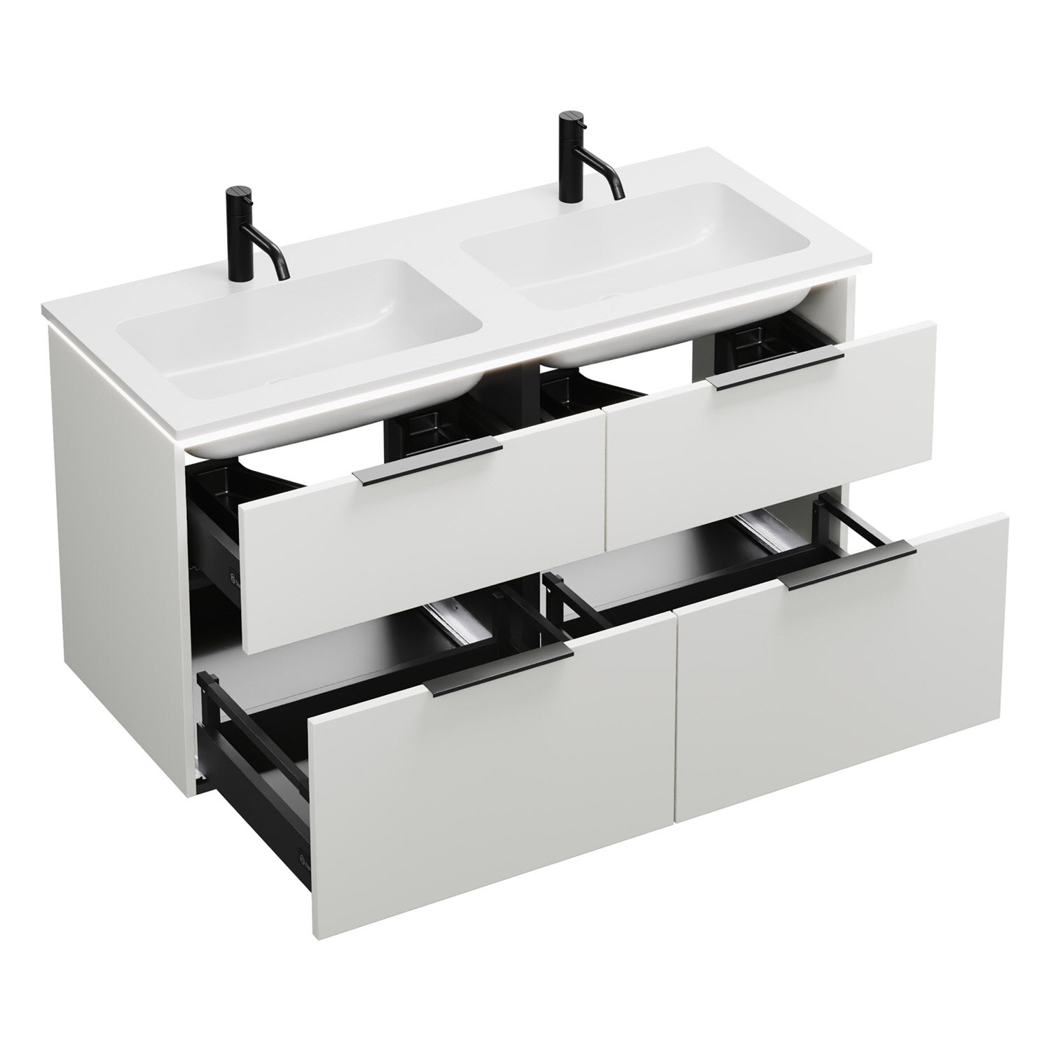 - 2 Schubladen oben, 35 cm tief, mit Siphonausschnitt und Inneneinteilung