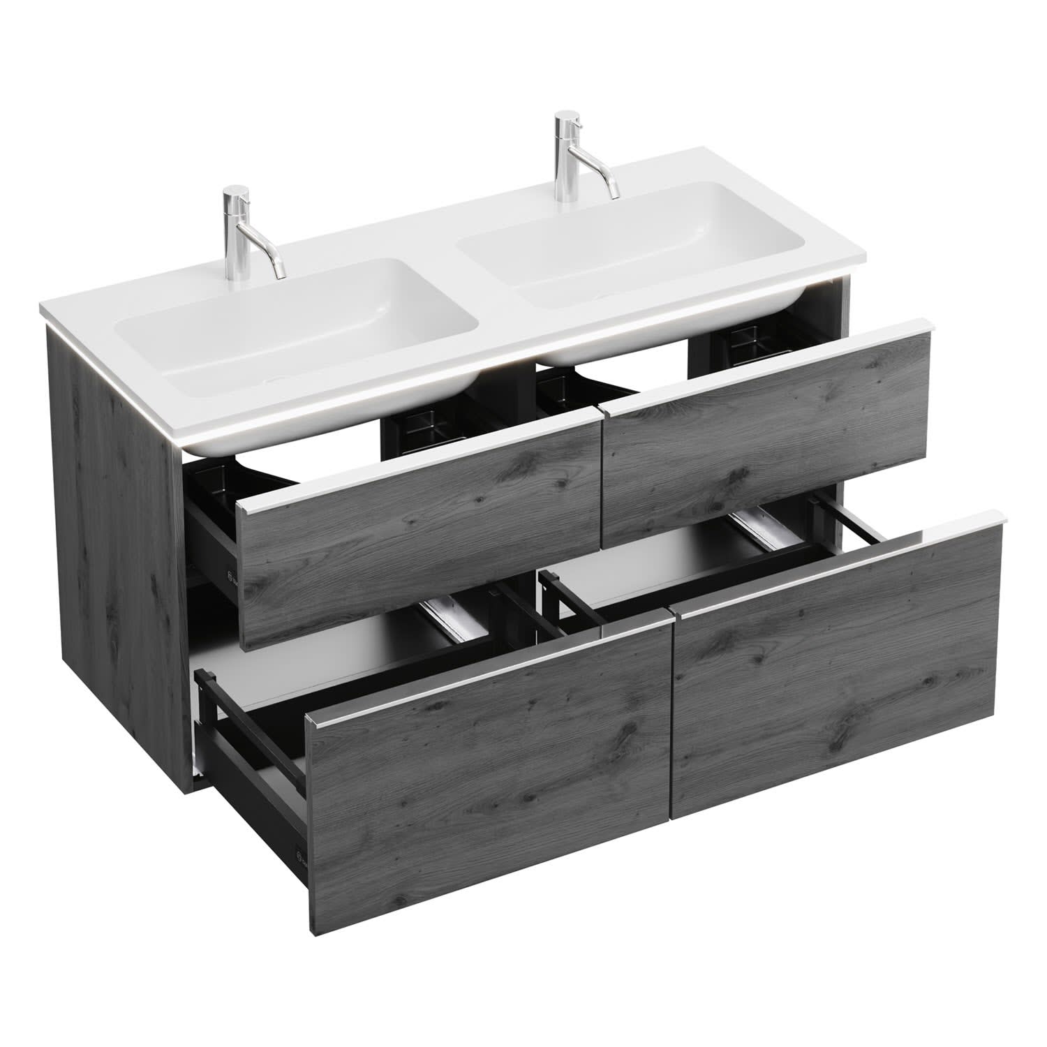 - 2 Schubladen oben, 35 cm tief, mit Siphonausschnitt und Inneneinteilung