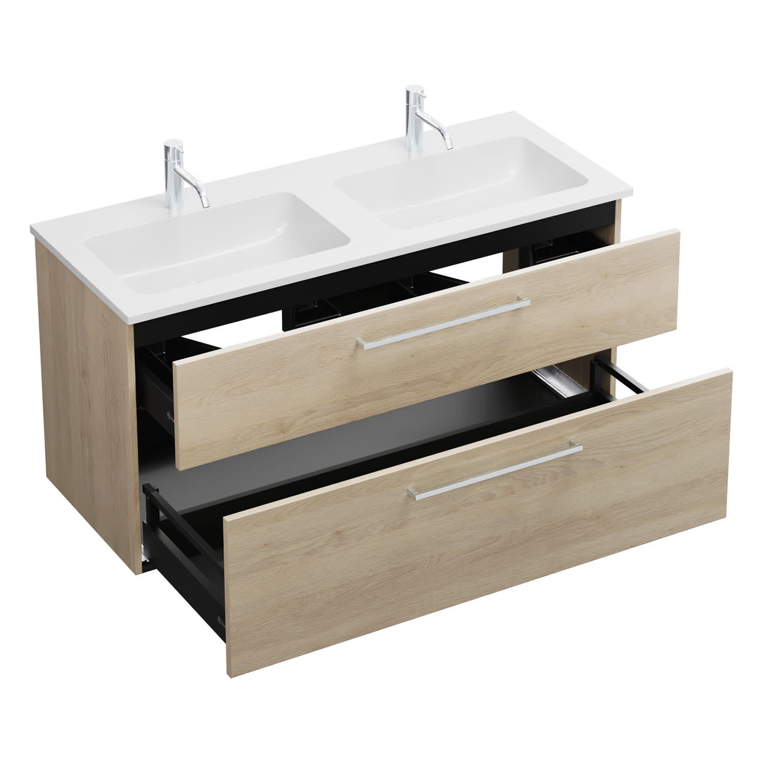 - 1 Schublade oben, 35 cm tief, mit 2 Siphonausschnitten und Inneneinteilung