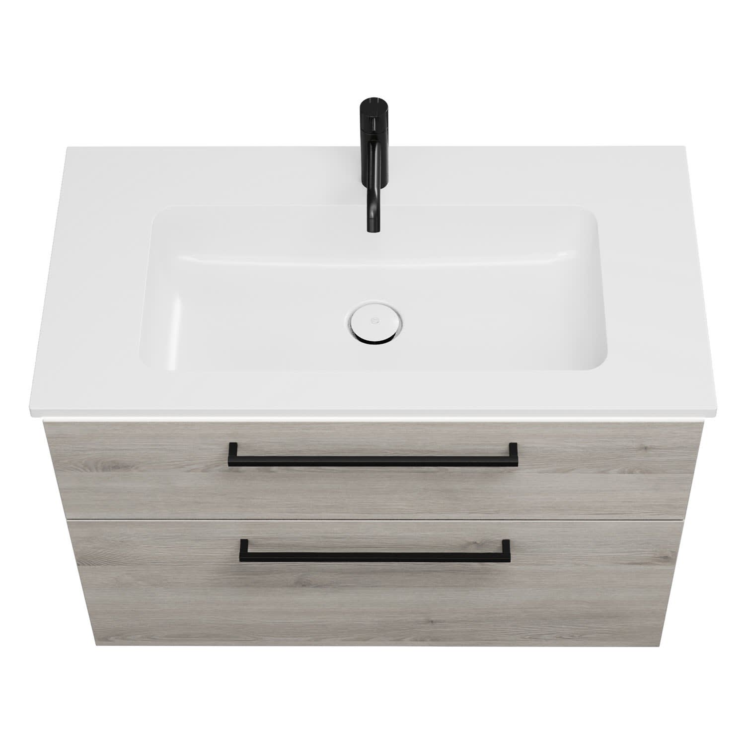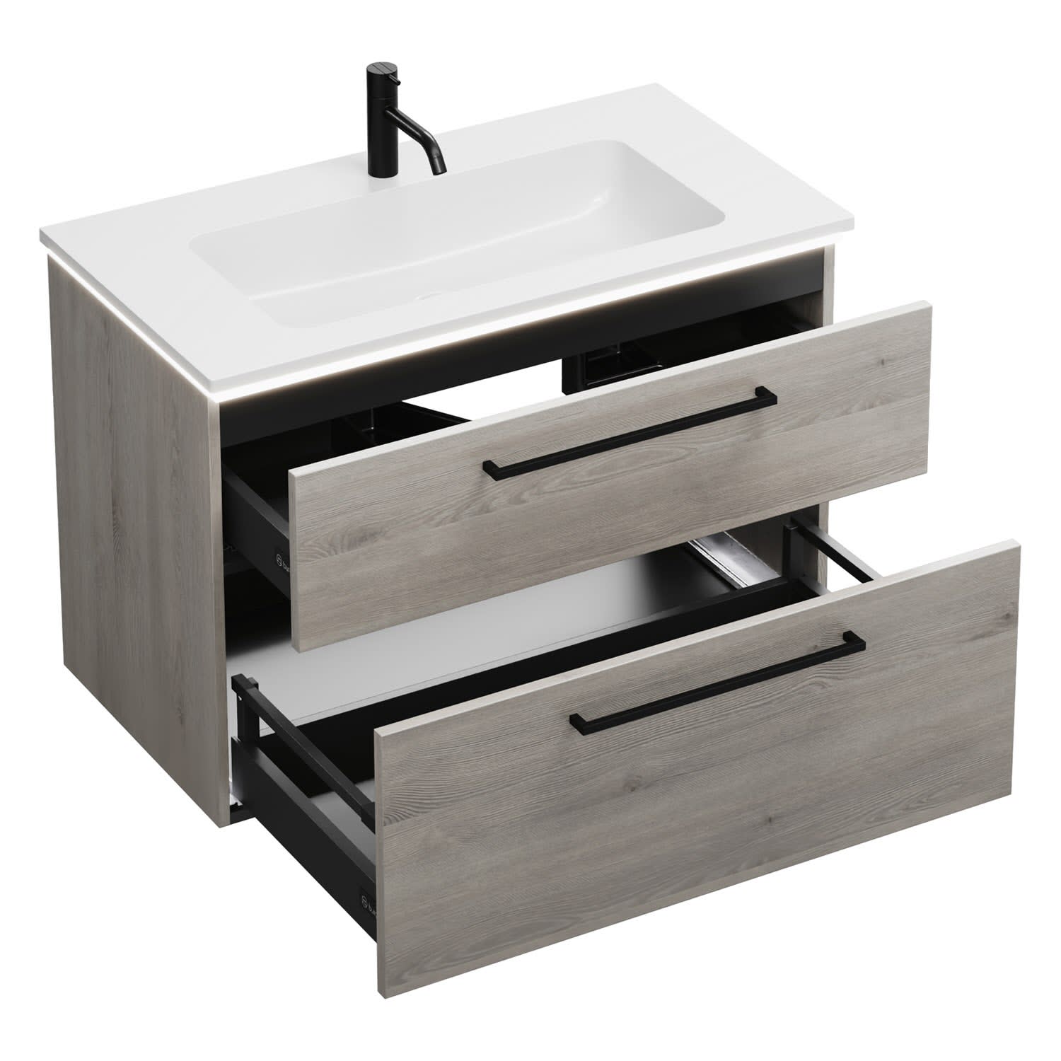 - 1 Schublade oben, 35 cm tief, mit Siphonausschnitt und Inneneinteilung