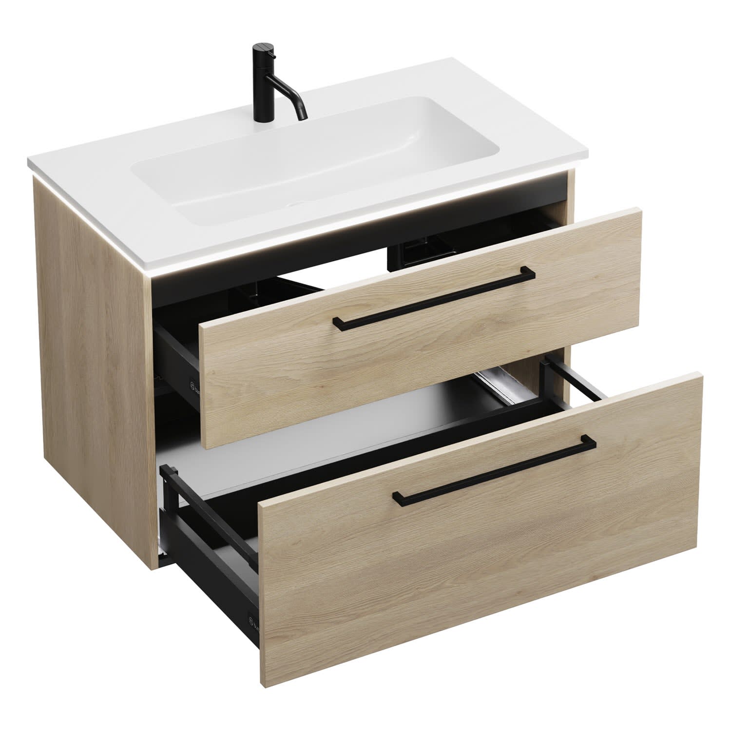 - 1 Schublade oben, 35 cm tief, mit Siphonausschnitt und Inneneinteilung