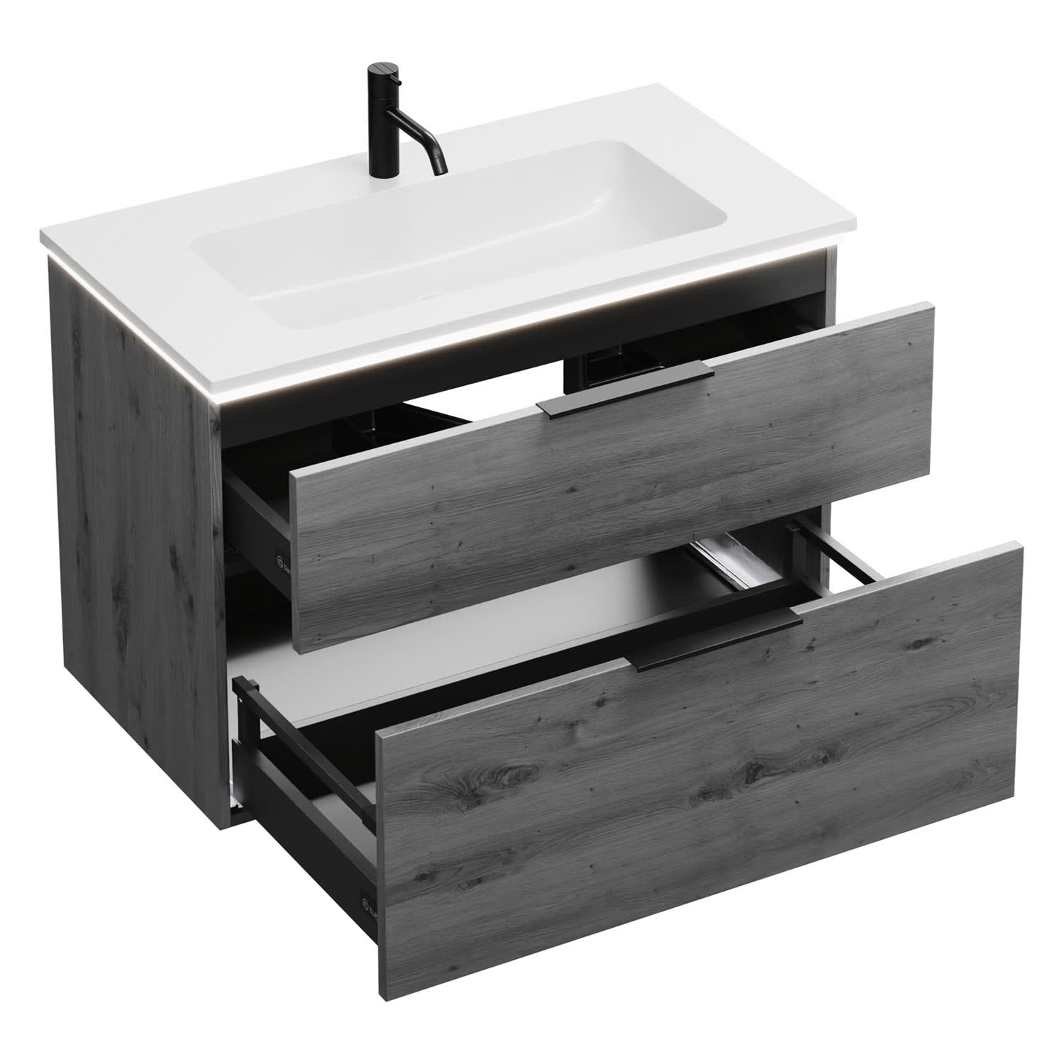 - 1 Schublade oben, 35 cm tief, mit Siphonausschnitt und Inneneinteilung